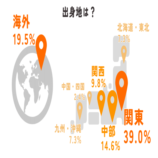 関東出身者が多数派を占めるなか、5人に1人は海外出身というデータが目を引きます。