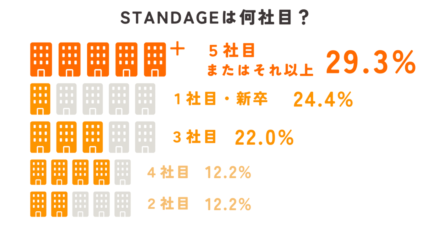 加えて、1年目≒新卒社員の割合が2番目に多いということで、スタートアップ企業でありながら新卒人材を積極採用し、主力として活躍しているSTANDAGEらしさも表れています!