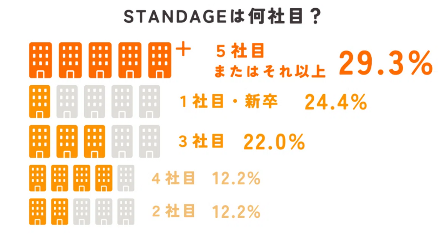 加えて、1年目≒新卒社員の割合が2番目に多いということで、スタートアップ企業でありながら新卒人材を積極採用し、主力として活躍しているSTANDAGEらしさも表れています!