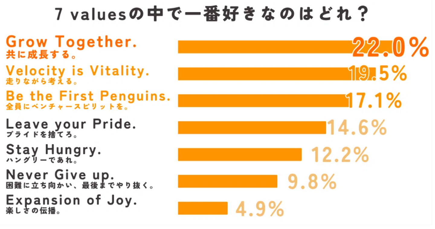 さらに僅差で「Velocity is Vitality. 走りながら考える。」「Be the First Penguins. 全員にベンチャースピリットを。」が続きます。