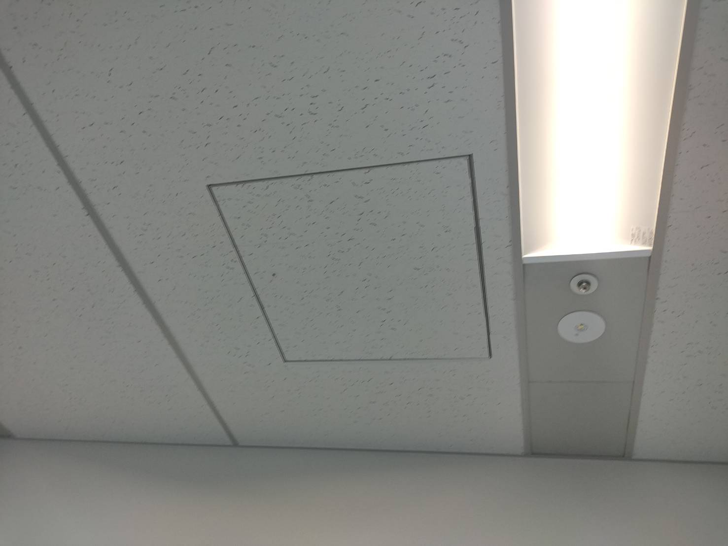 点検口、、、?よく似ていますが、排煙口というものだそうです。 排煙口とは、火災が起きた際に煙を吸い込む口のことで、これをあけてしまうとビル内にある火災機器が作動することになるので注意が必要です。オフィスビルの場合だと入居しているご法人様すべてに迷惑がかかります。恐ろしい、、