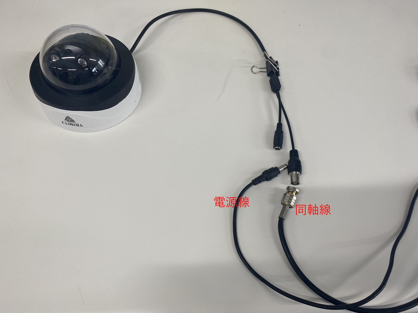 本題に入る前に少しカメラについて説明します。基本的に防犯カメラには2本の配線が必要です。2本の線とは電源線と同軸線です。