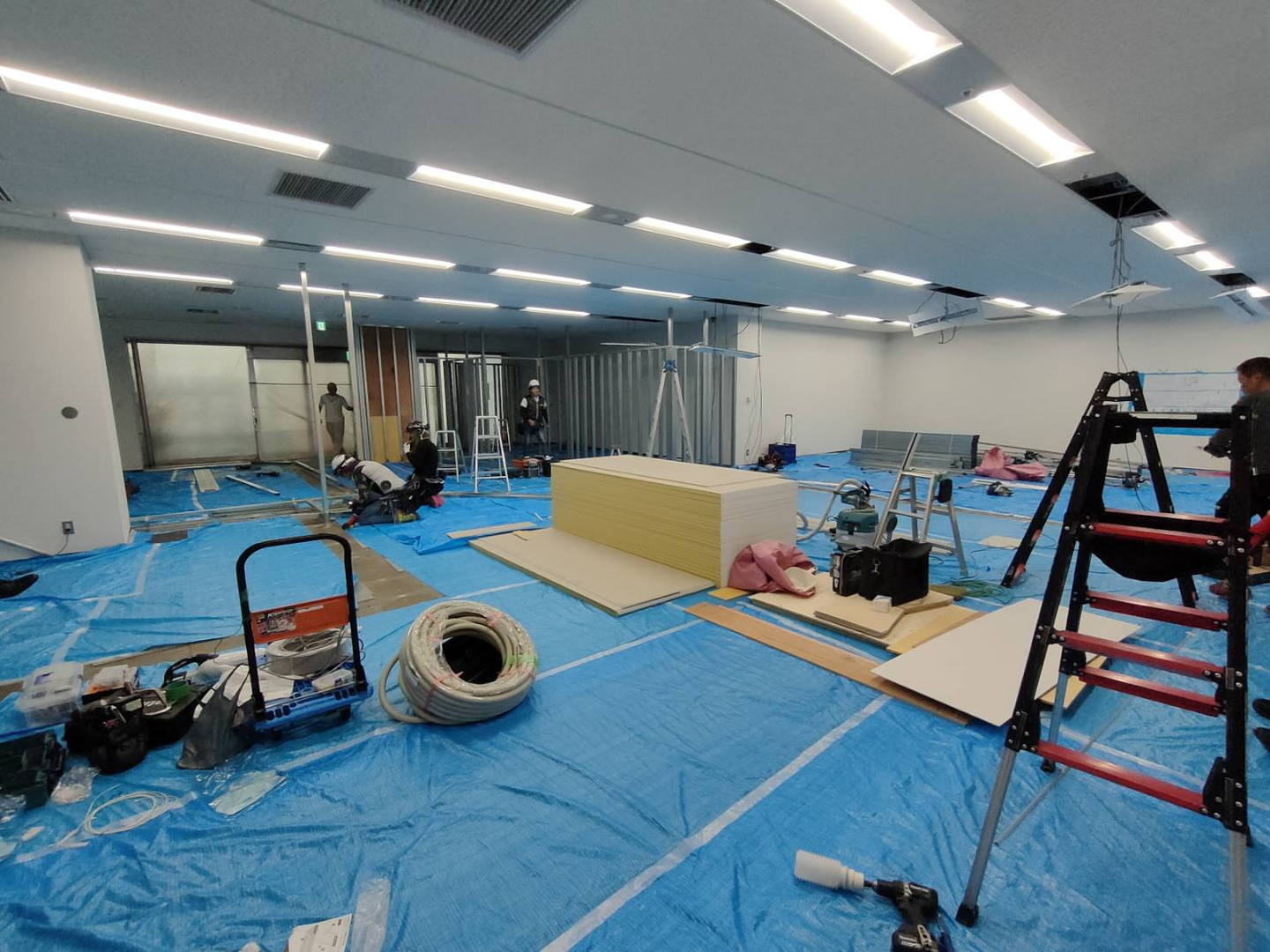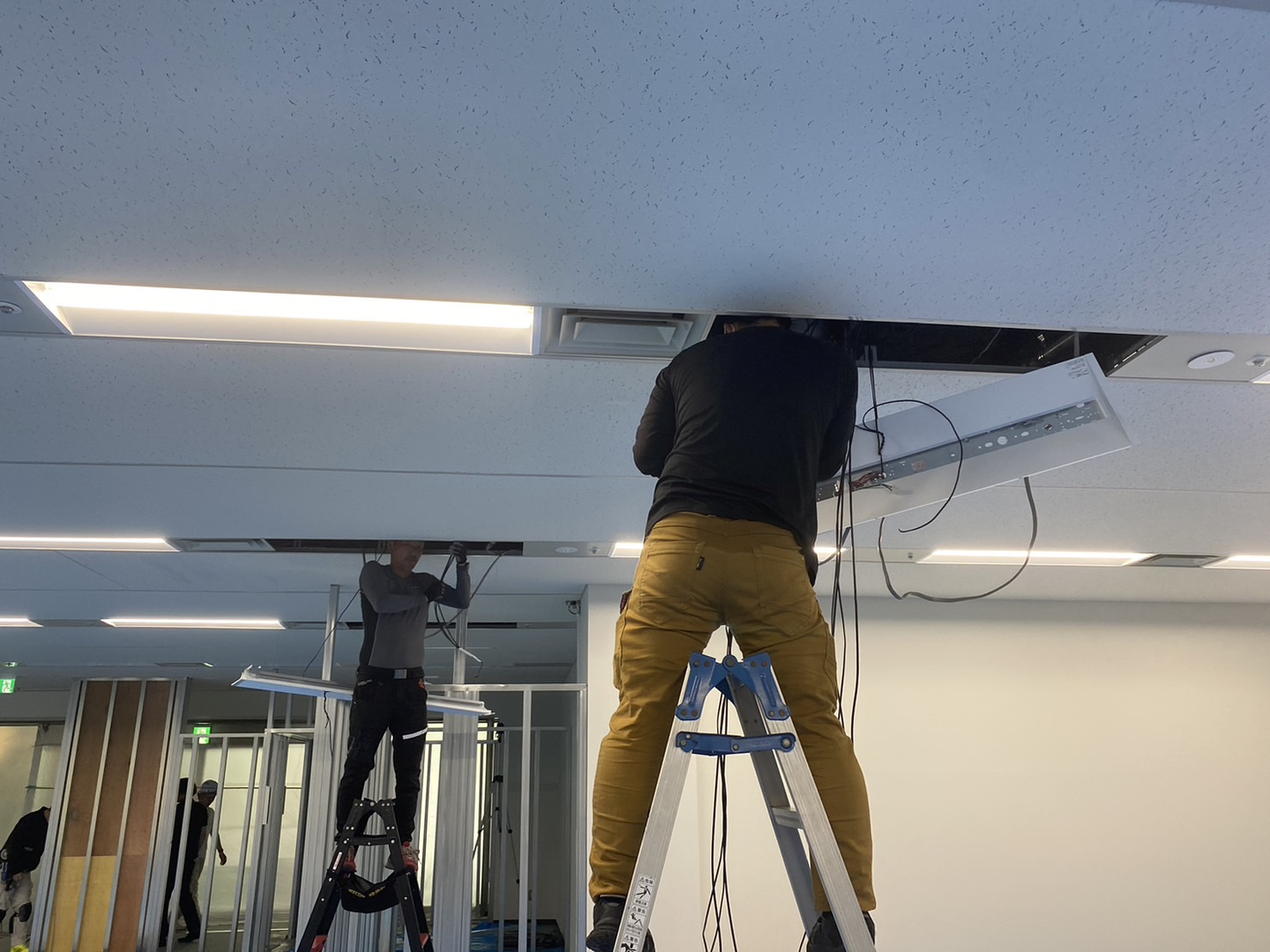 天井内配線の作業中です。蛍光灯を外して天井内に線を入れていきます。