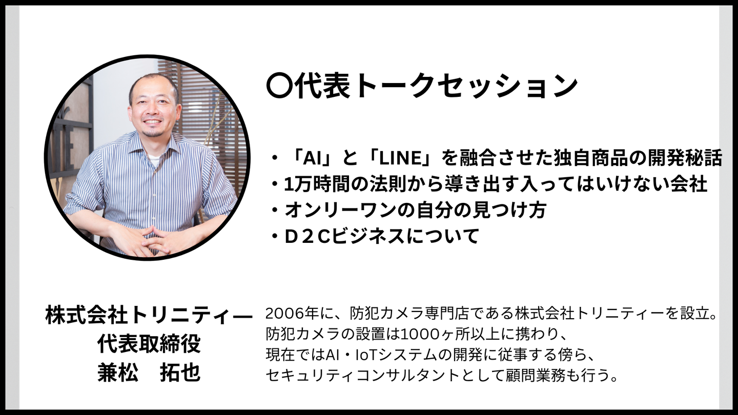 トリニティーは、セキュリティのプロフェッショナルカンパニー。カメラを海外でOEM生産、AIやIoTのソフトウェアを自社開発し、国内のお客様に直接届けるD2C企業です。製造から販売までをワンストップで行うことで質の良い製品を安くお客様に届けることができます。2006年に設立され、映像セキュリティーでは老舗企業に近づいていますが、AIoTの分野ではまだまだベンチャー企業といえます。ここ14年間連続黒字の安定企業にもかかわらず、チャレンジ精神が豊かな会社です。