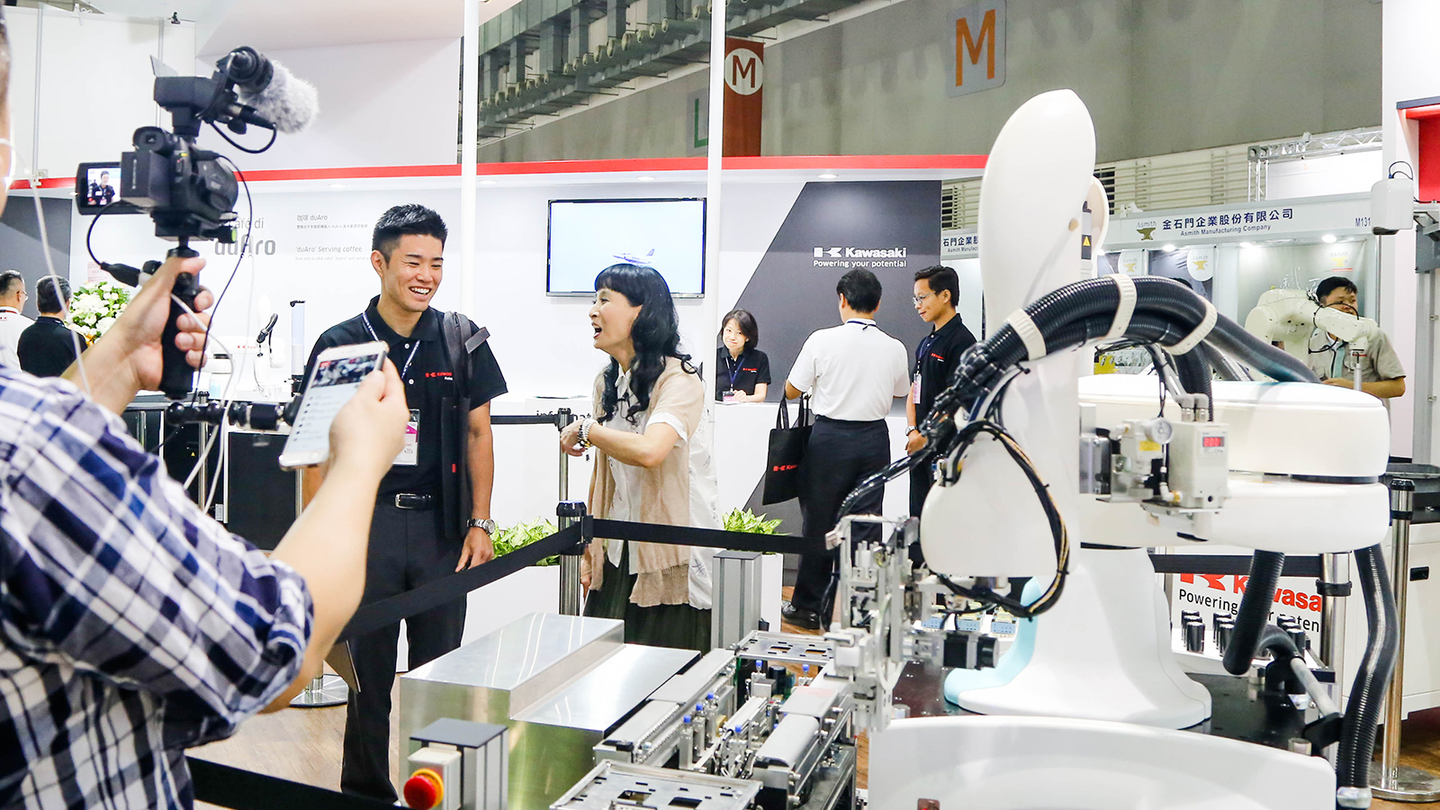 ↑台湾国際ロボット展にて。営業担当者としてオール中国語で現地メディアの取材に対応