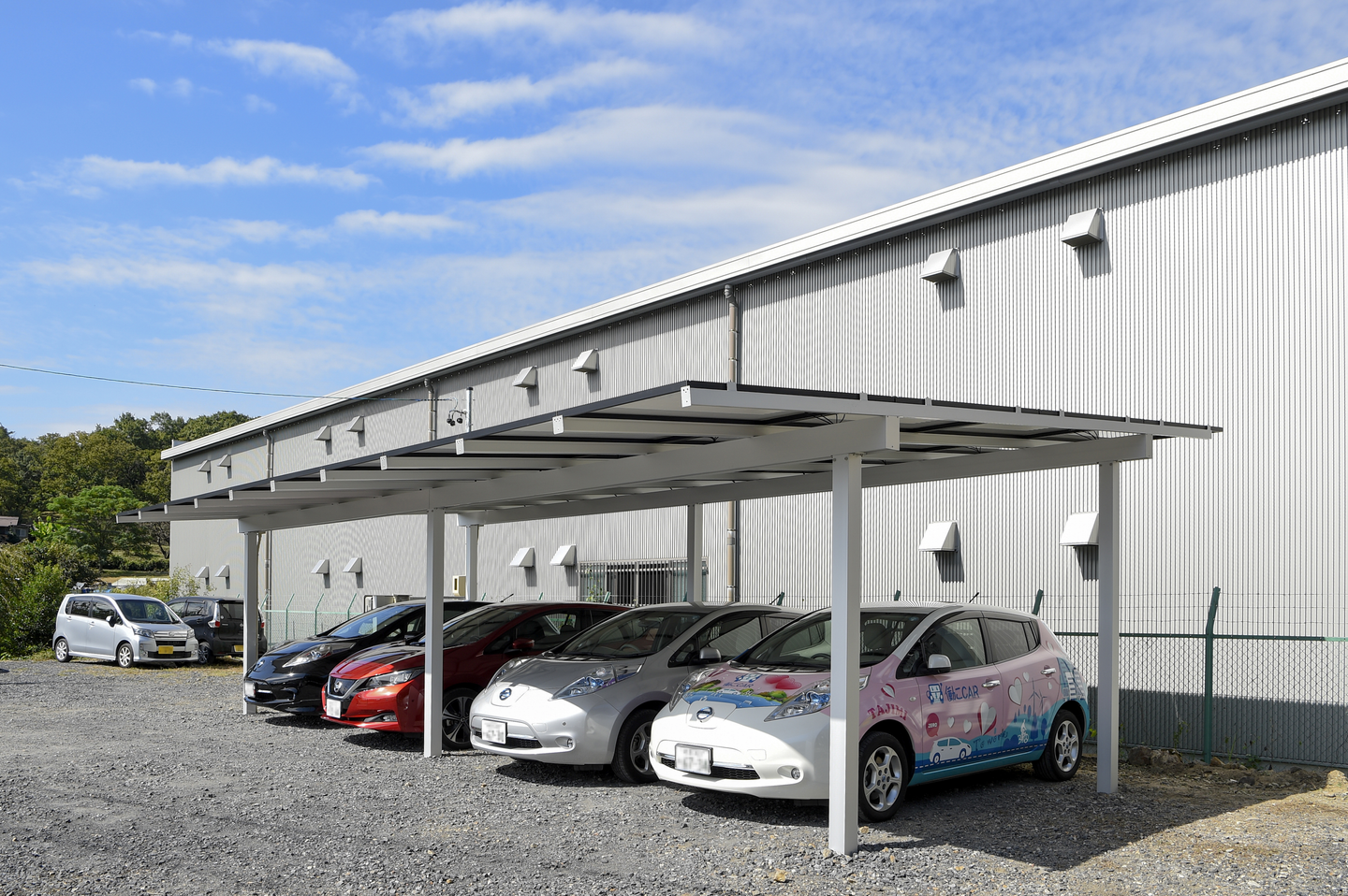 このカーポート型のソーラーチャージャーは、太陽光パネルを設置しているため、地域内の分散型発電所としての機能を持っています。