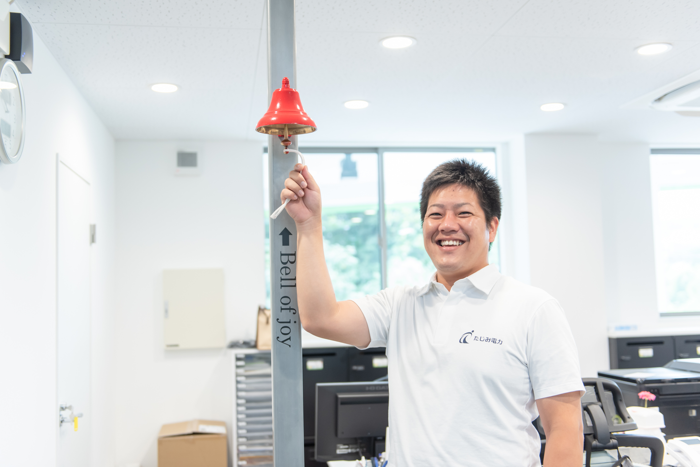 ベルを鳴らすニコニコの社長(^o^) きっと良いことがあったんですね!
