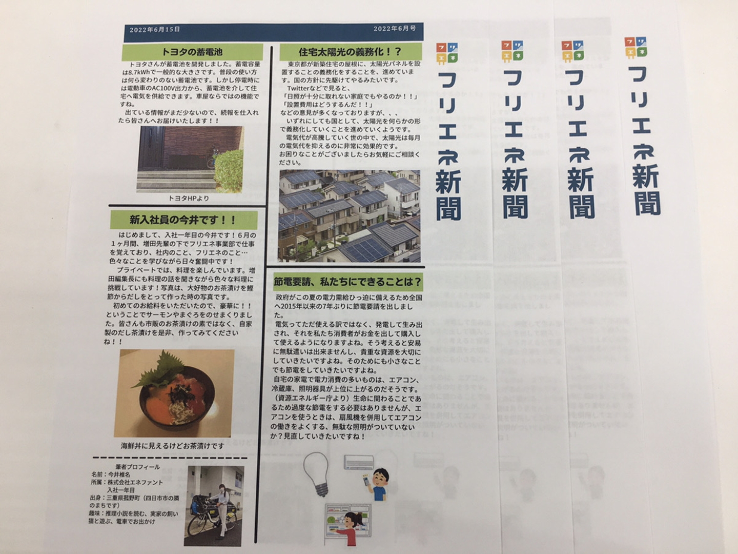 この新聞には、電気やエネルギーに関すること、弊社のスクープ記事や今井の近況など…のポップな内容の記事を掲載します。最終的に工務店様にお配りし見ていただくものになるためどんな記事を書こうか?と少々悩みました。