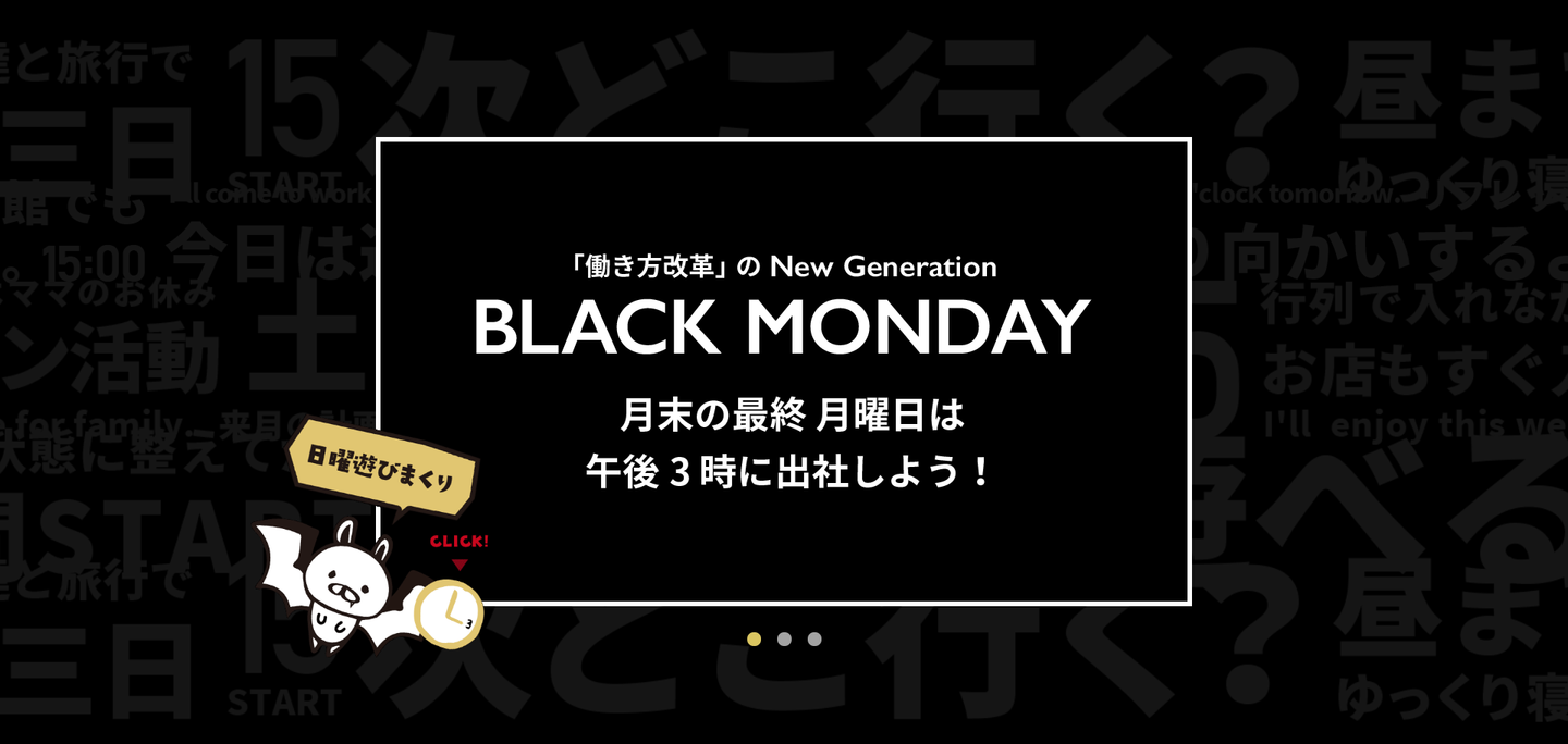 ブラックマンデーとは、毎月最終の月曜日の出勤時間を15時とし、前日や月曜日の朝を有効活用してリレッシュできる制度です。