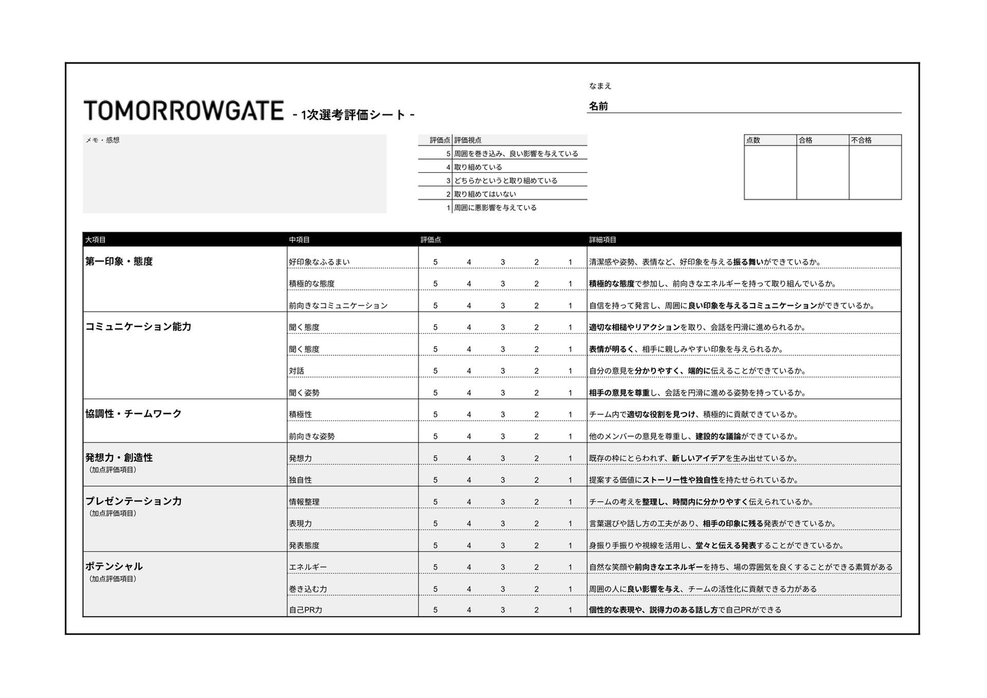 トゥモローゲートでは、全選考の評価に「第一印象」という評価項目を設けています。