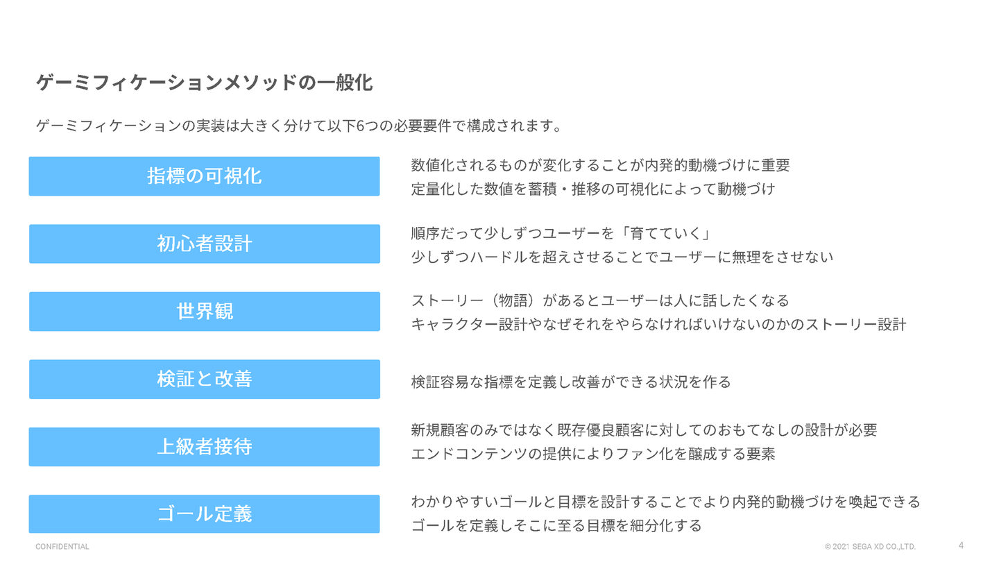 ゲーミフィケーションは発展途上の分野で、様々なフレームワークや考え方が存在します。ここではセガ エックスディーが提唱する「ゲーミフィケーションメソッド」と突き合わせつつ、子供にとって望ましいプロダクト設計のポイントをご紹介できればと思います。