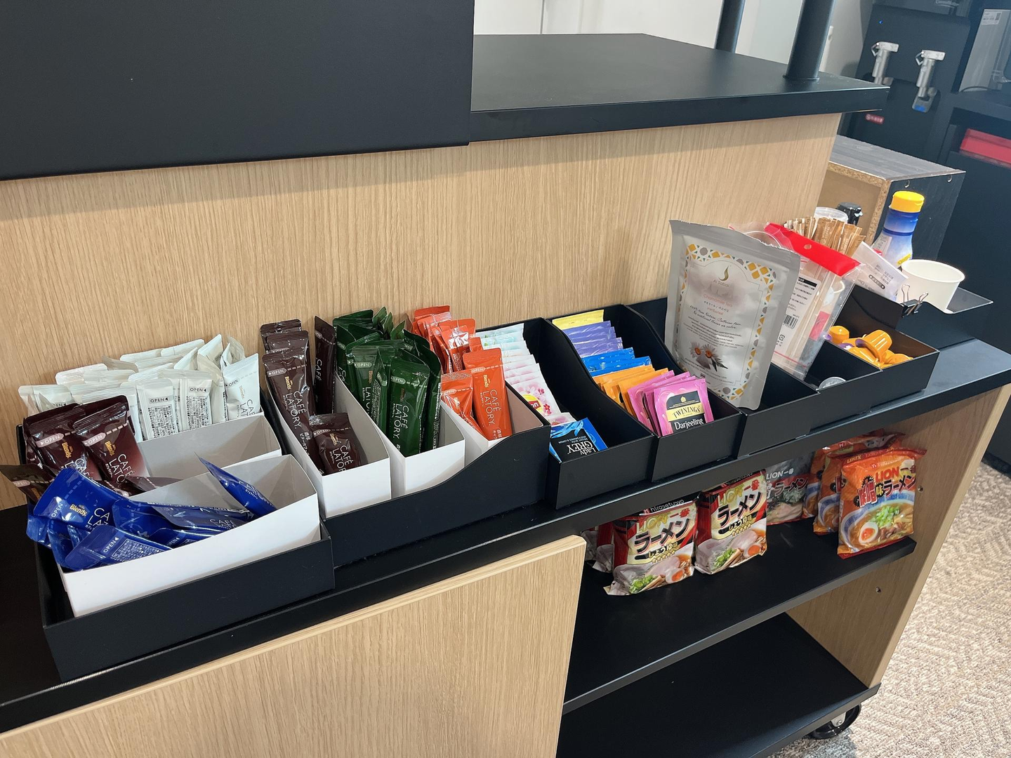 ▼紅茶やスティックコーヒーも常備。リクエスト受付中!(なんかラーメンもある)