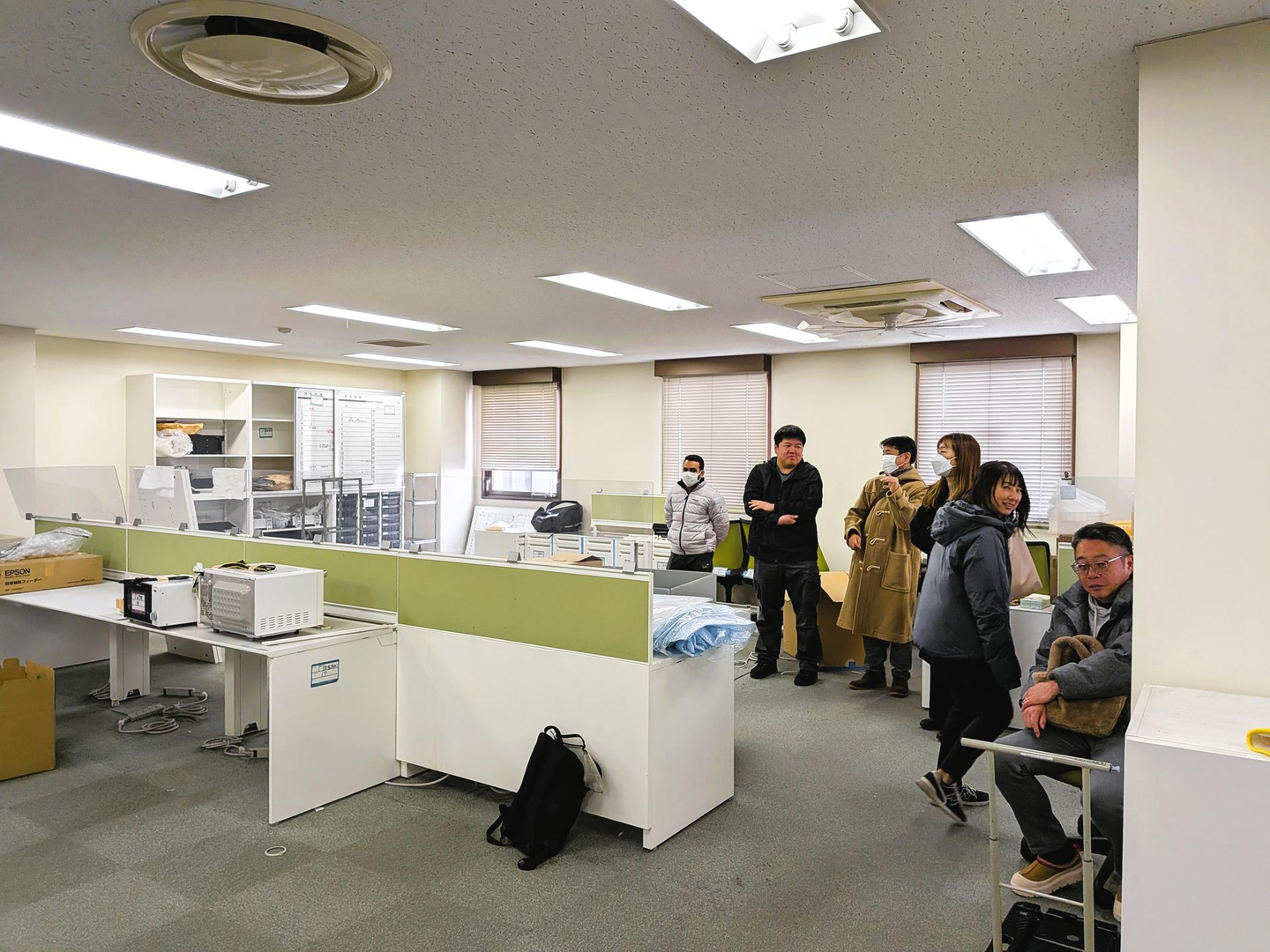 事務所内から荷物が運び出される様子を見守る社員たち。
