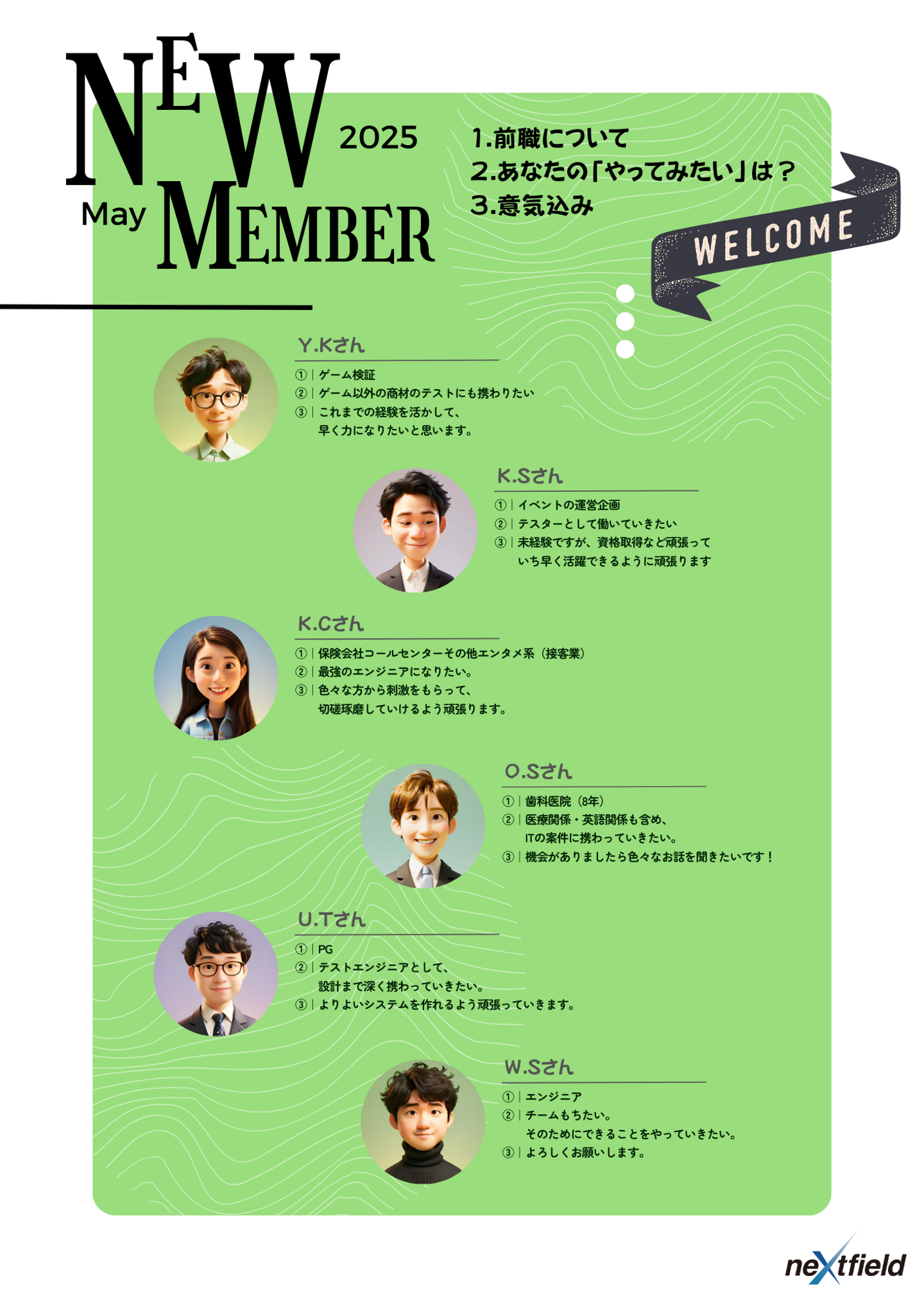 ネクストフィールド株式会社フォローhttps://nf-nextfield.com/recruit東京都フォローホーム私たちについてメンバーストーリー募集 \NEW Member May2025/ Baba Saeko 広報 on 2025/05/22 5月入社メンバーをご紹介🥺🌸🔸🔹2025年5月は、中途6名にご入社いただきました🔸🔹 ネクストフィールド株式会社では一緒に働く仲間を募集しています \NEW Member May2025/ Baba Saeko ネクストフィールド株式会社 / 広報 中途 中途採用 エンジニア 新入社員 未経験 シェア