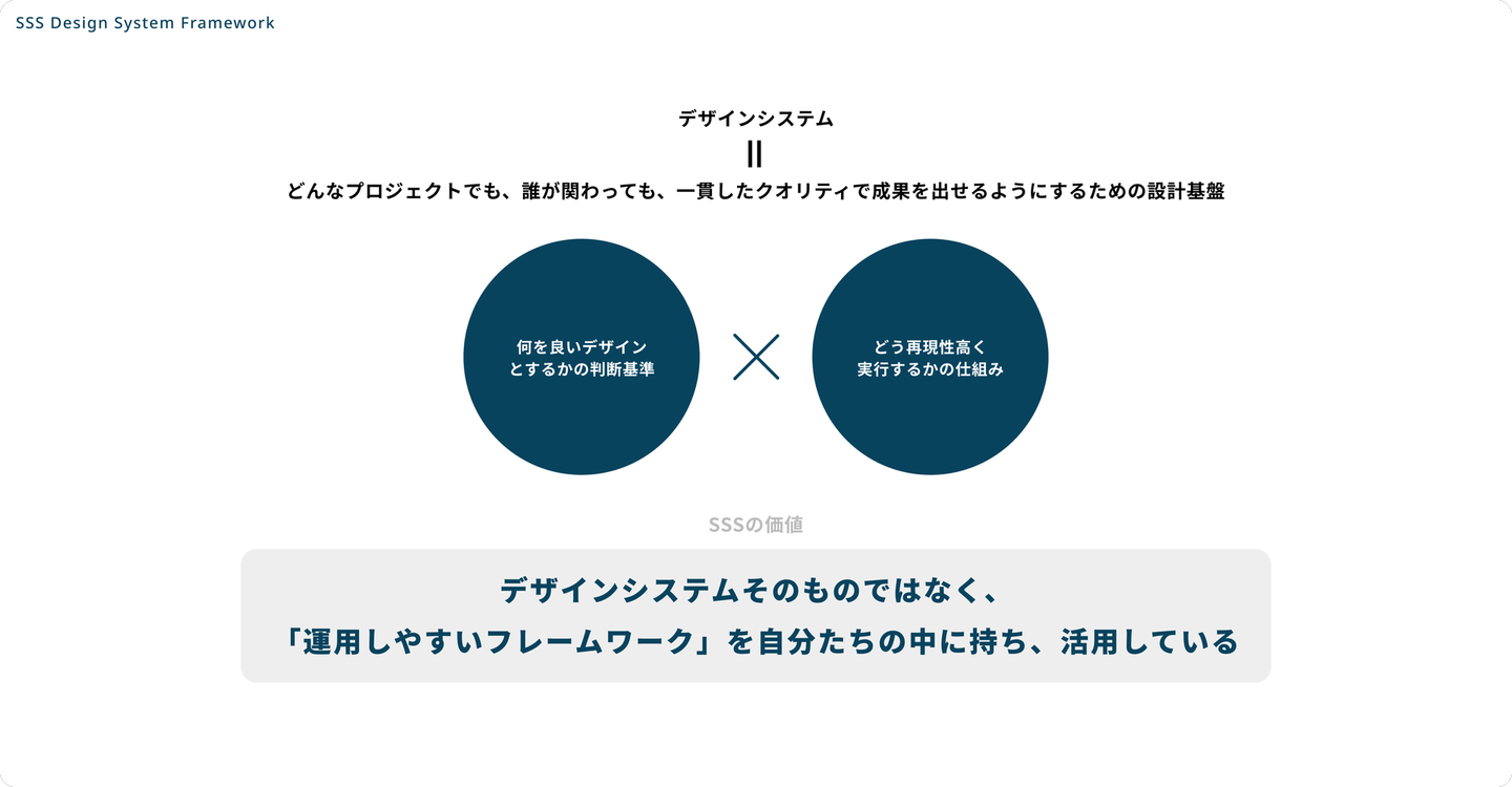 一般的なデザインシステムが「自社製品のために決められた型にはめる仕組み」だとすれば、SSSのデザインシステムフレームワークは「どんなクライアントの課題にも対応できるための土台と、その考え方」です。