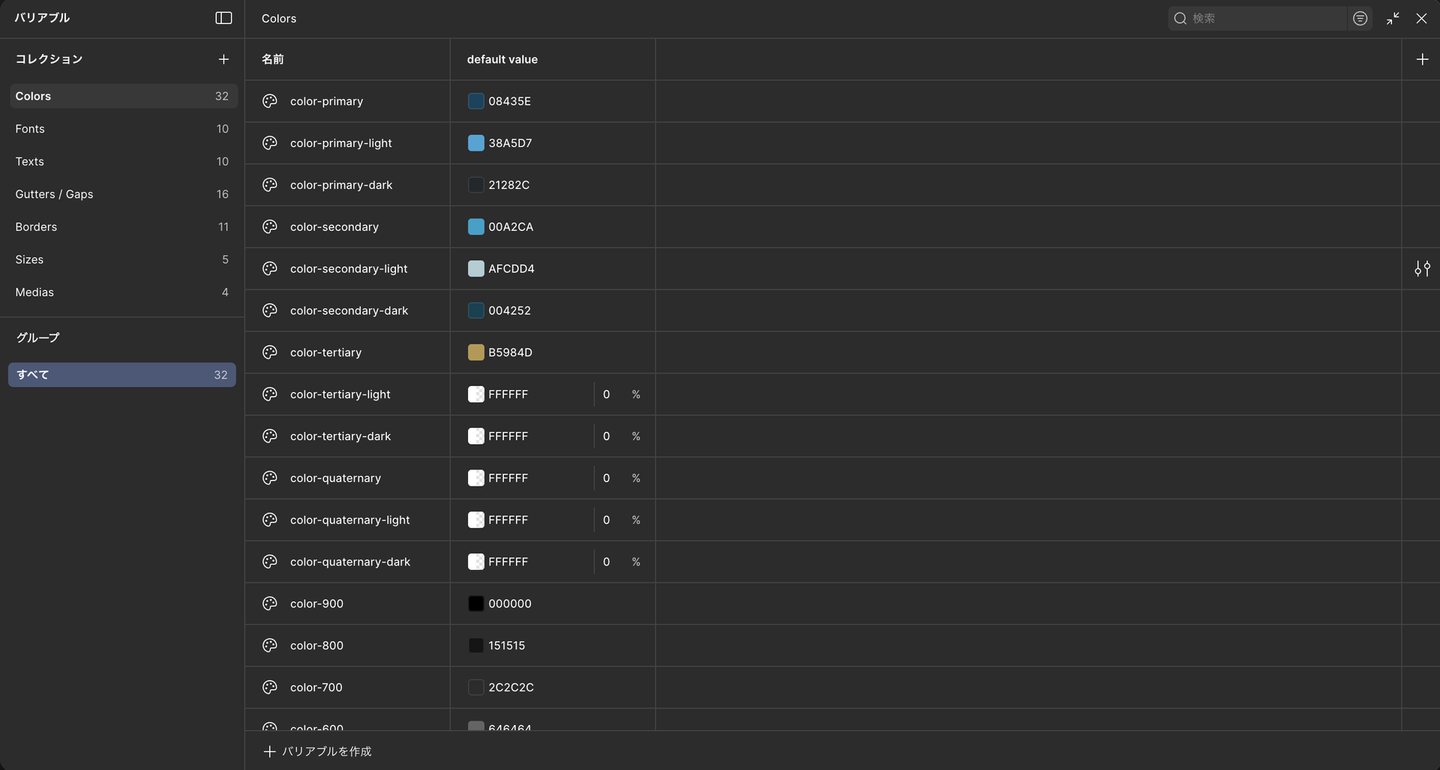 これらを定義せず、デザイナーが感覚的に Hexコード(#333) や px数 を指定してしまうと、実装時に「このグレーとあのグレーは同じ意味なのか?」「余白が2px違うが意図的なのか?」という不毛な確認作業が発生します。 変数を共通化することで、デザインの意図がコードに直結し、実装ブレをゼロに近づけることができるのです。