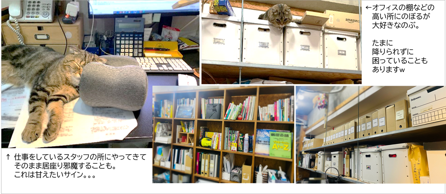 現在は、東京オフィスもフリーデスクになっており、出社したときは空いている席で仕事をしています。たまに、猫に仕事の邪魔をされながら(笑)、制作スタッフは必要な状況に応じて出社、企画のスタッフは、デスクワークが多いため、ほとんどテレワークの業務が中心となっています。