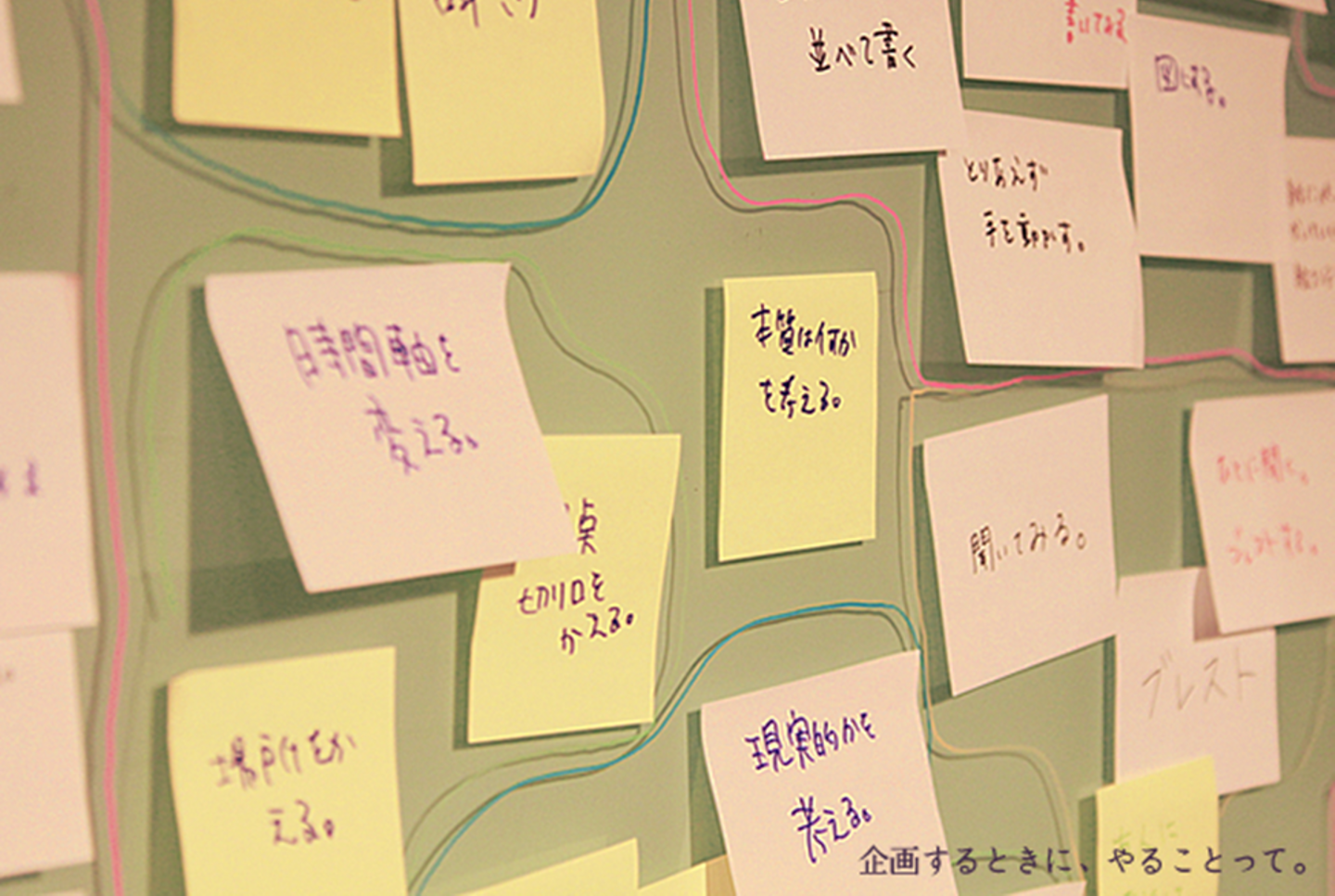 わたしたちの携わる企画は、単にプランナーがPCに向かい、一人でアイデアを考えるというものでなく、どちらかというと、チームの共同作業で作り上げていくものがほとんどです。(実際の企画書の作成作業に入ると、黙々としたものであり、また時間との勝負でもあります。)