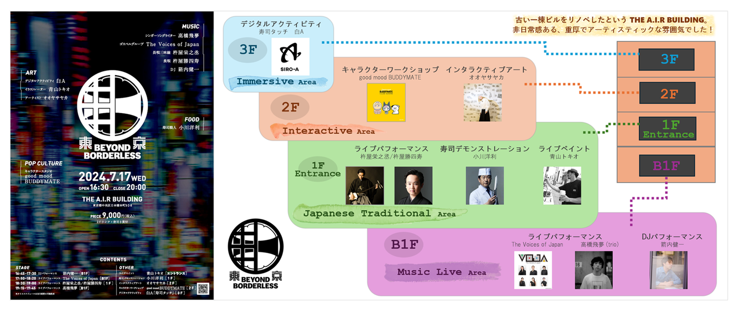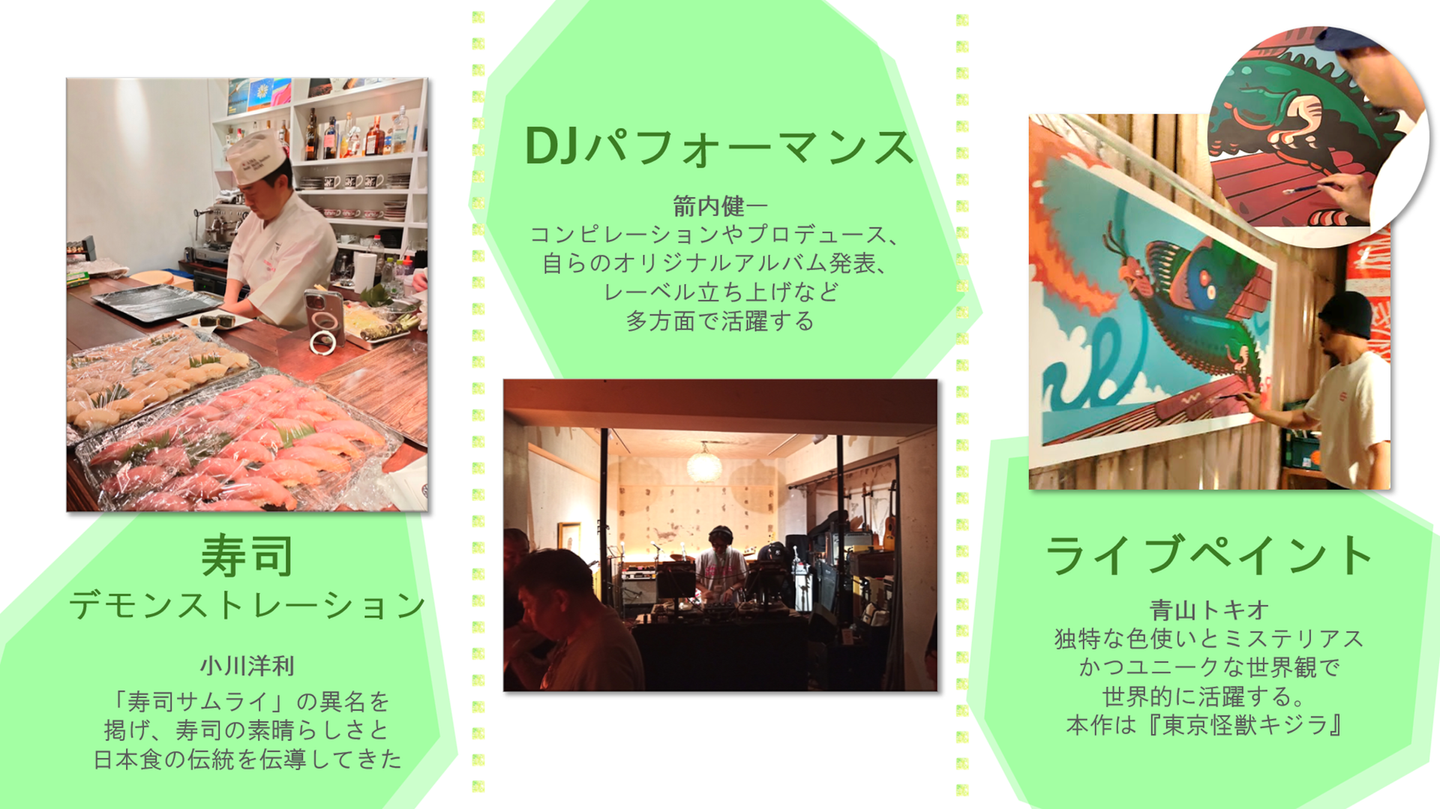 「インバウンド」「ナイトエコノミー」「大人が鑑賞できるエンタメコンテンツ」「東京(国内)ローカルから世界へ」「体験型観光コンテンツ」「日本初のポップカルチャー」といったキーワードをコンセプトに、「今」魅力ある音楽+アート+食+ポップカルチャーを、東京から世界へ発信する体験型Show case event。バーチャルでは不可能な「五感+α」で楽しめるイベントでした。