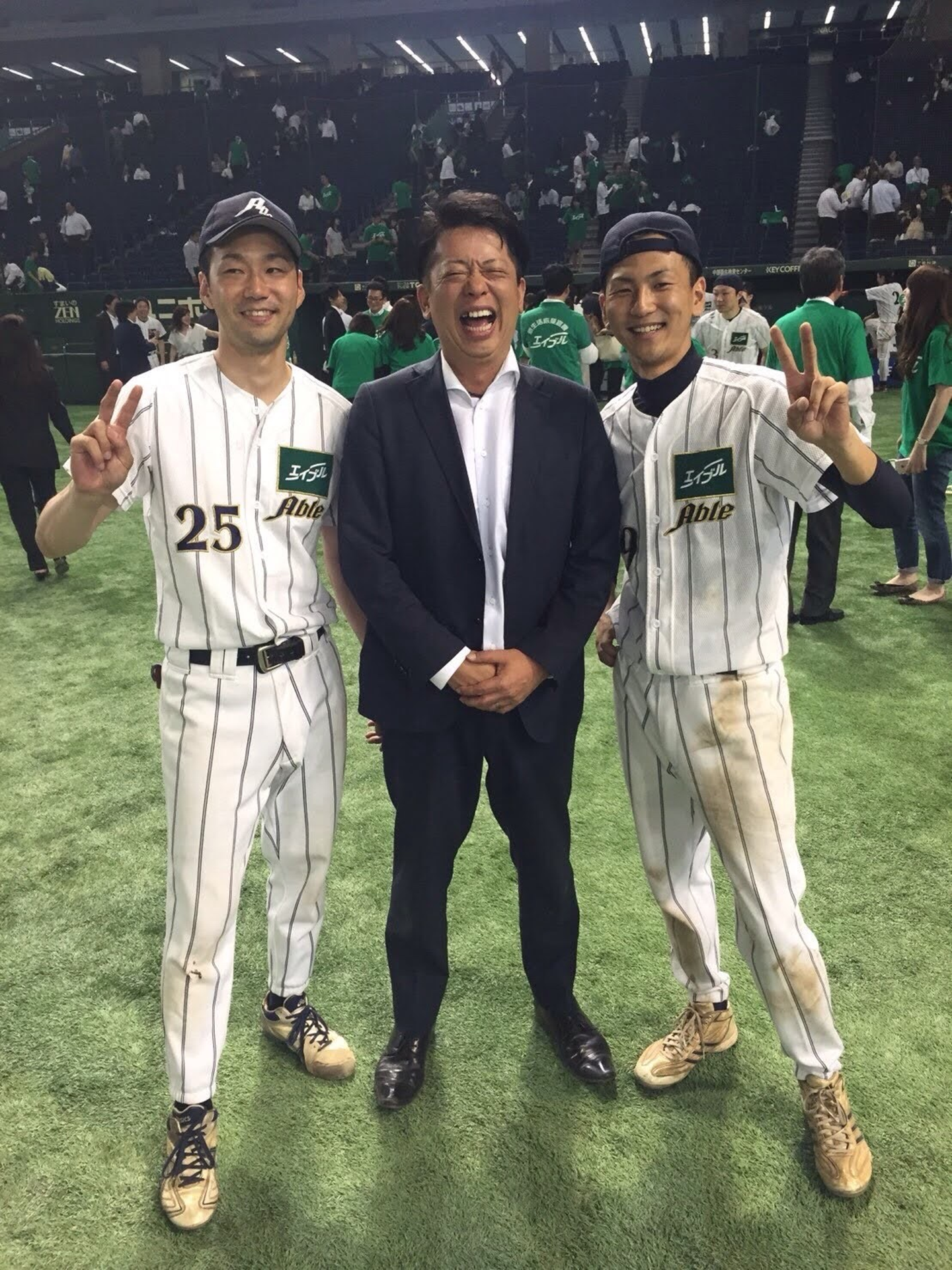 不動産業界開催の野球大会の懇親会にて:椎名さん(左) 荒川さん(右)当時24歳
