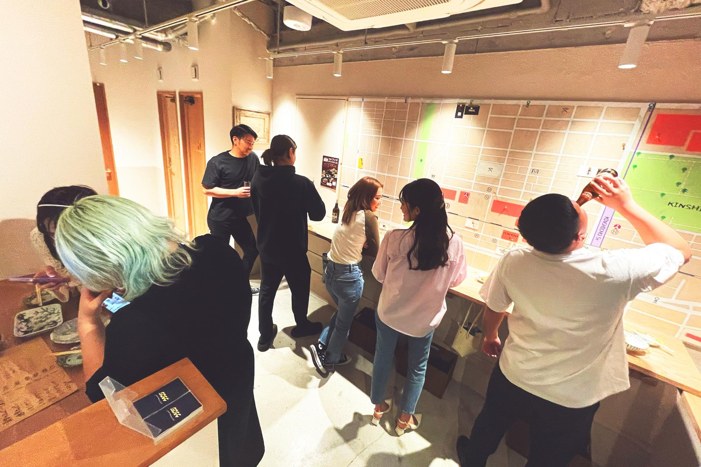 「ロジコーヒー、」閉店後の16時から開く立ち飲み店舗。店内の壁には錦糸町のマップがあり、近隣の飲食店など地域の情報を集めています。