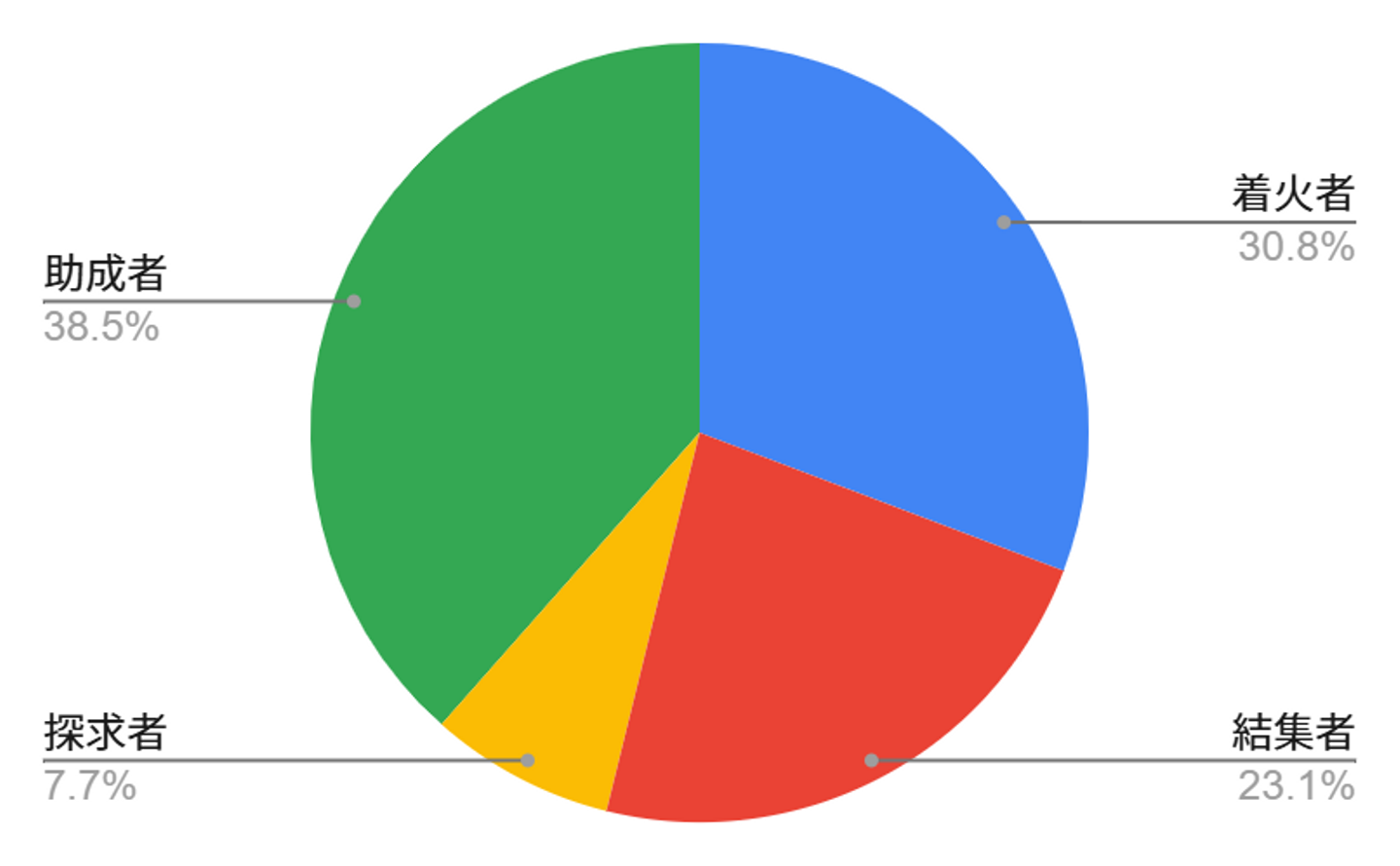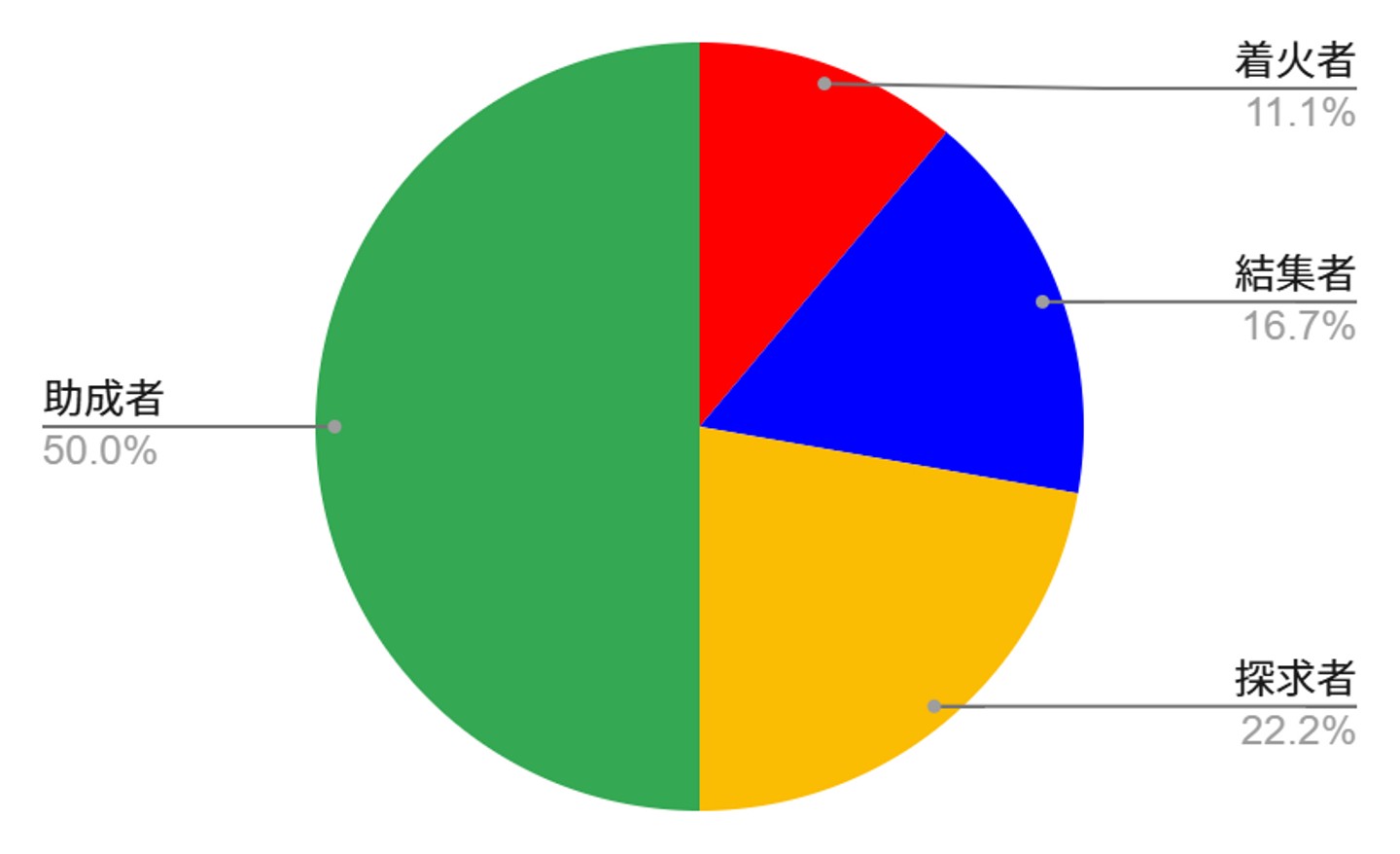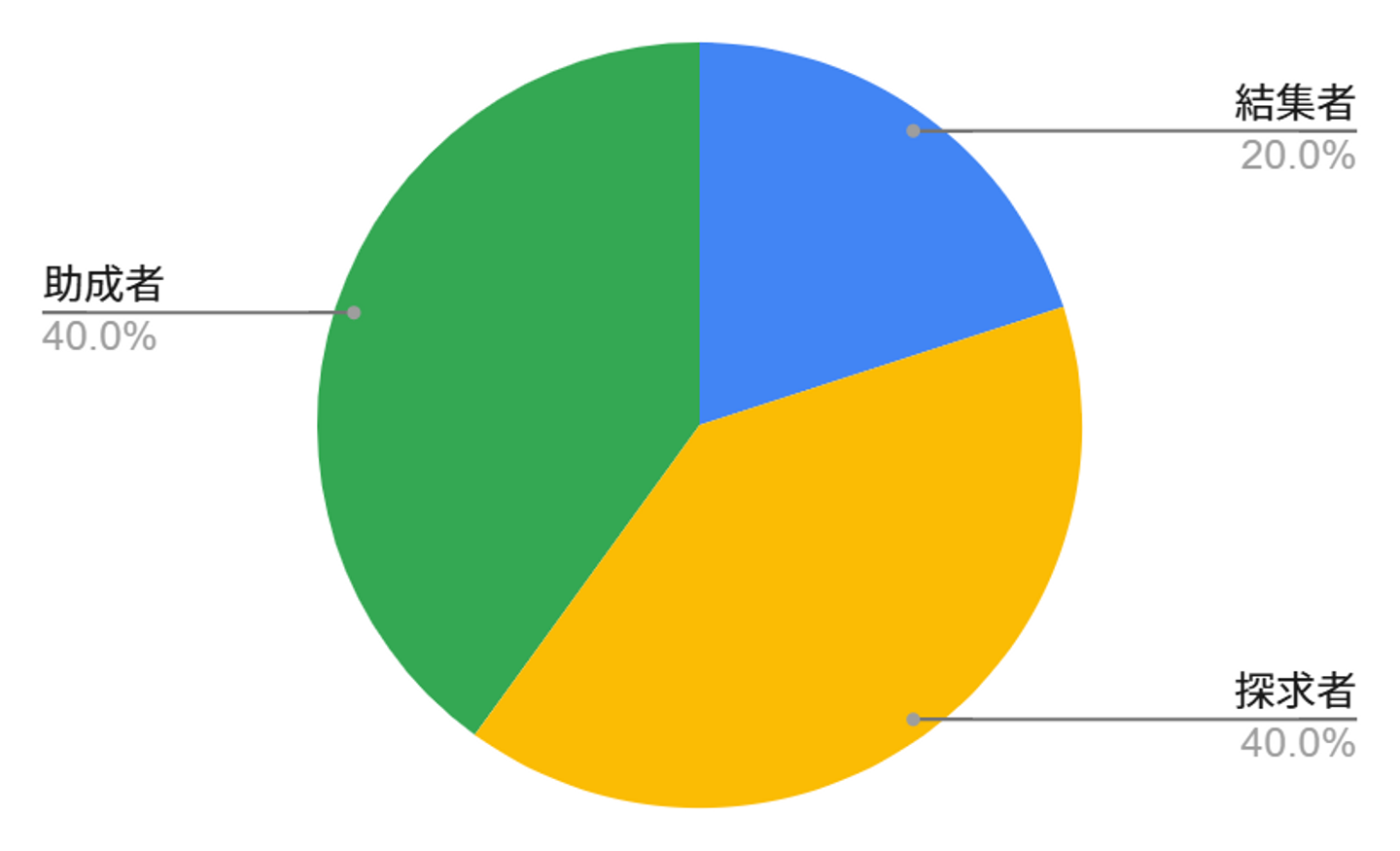 探求者(チームに変化をもたらす探求家)と助成者(チームを支えるサポーター)が同じ割合でした!