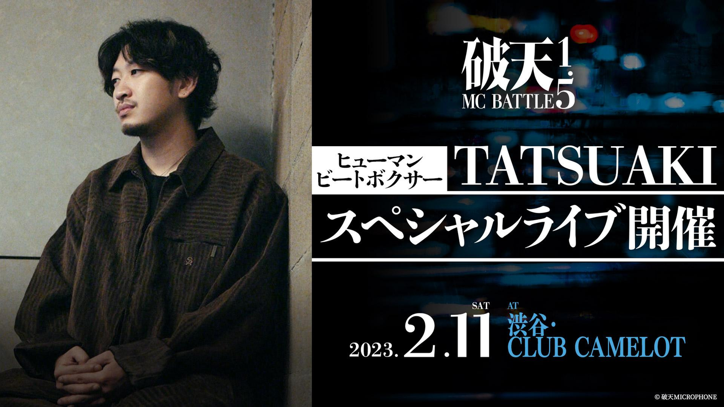 2023年2月11日(土)に実施する『破天MCBATTLE 1.5』にて、日本を代表するヒューマンビートボクサーの一人であるTATSUAKIさんのスペシャルライブ開催が決定いたしました。