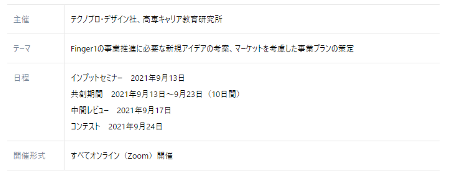 株式会社テクノプロ テクノプロ・デザイン社(以下、テクノプロ・デザイン社)は、株式会社高専キャリア教育研究所(以下、高専キャリア教育研究所)と共催で、高等専門学校の生徒を対象として「Finger1※ Start up challenge ! 〜テクノプロの「本物」の新規事業の未来を考える事業プランコンテスト〜」と題した、ビジネスプランコンテストを開催しました。