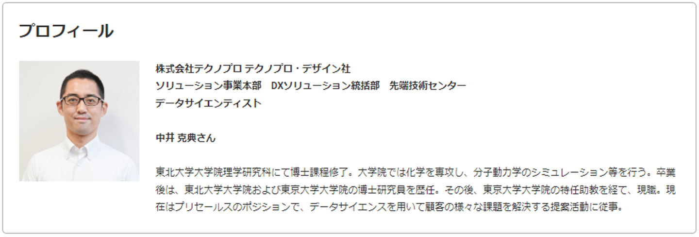 株式会社テクノプロにてデータサイエンティストとして勤務する中井克典さん。大学院を卒業後は研究員や特任助教として勤務し、アカデミアの道を邁進していた中井さんがなぜ転職を決意し、民間企業で働くことになったのか。そして、テクノプロという会社やデータサイエンティストという職種を選んだ理由は何だったのか。その経緯や仕事への想いを本音で語っていただいた。