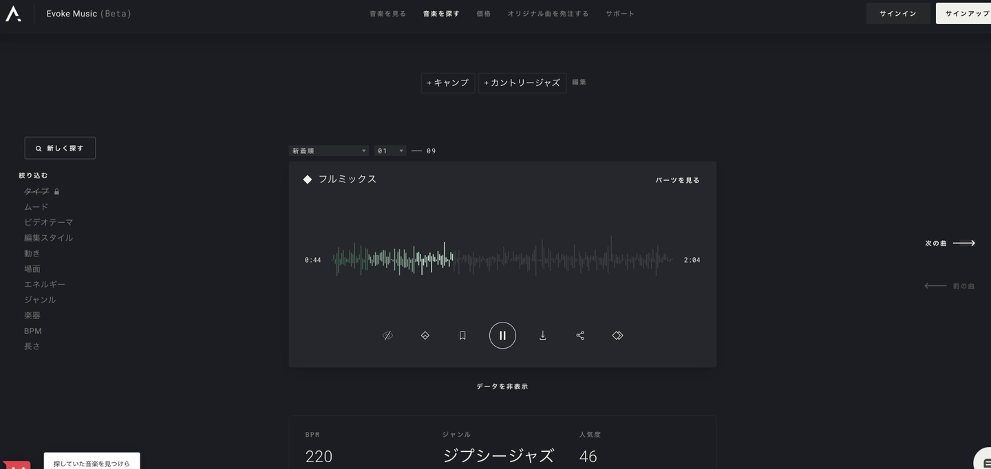 Evoke Musicは、その問題をAIが解決しました。Evoke Musicに登録されているBGMは全てAIによって作曲されており、著作権フリーで利用可能です。このAIの出発は、過去のヒット曲を分析し、「ひとけ」のある音楽を機械的に生み出すことだったようですが、今では作曲だけではなく、作曲された曲に情報を付与し、ユーザーはフリーワード検索で欲しい雰囲気の音楽を入手することができます。