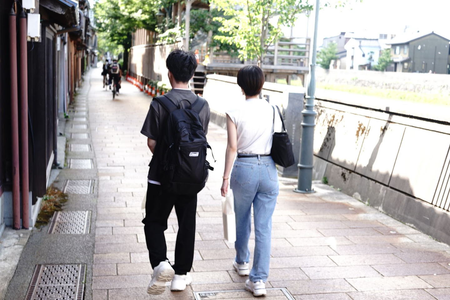 甘味を食べてお腹がいっぱいなので、ひがし茶屋街近辺を散策します。どこを歩いても風情があり、ゆっくりと時間が流れる感覚が心地よかったです。写真だと見えづらいですが、少し奥に、金沢の夏の風物詩『白糸川床』がありました。夏の期間限定で川に桟敷席が設置され、芸妓さんや食事を楽しめるそうです!