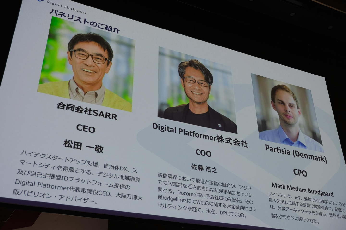 今回は、COO 佐藤がファシリテーターとなり、CEO 松田とPartisia社 CPO Mark氏とパネルディスカッションを実施しました。Partisia社とはフィンテックアプリケーション構築のため業務提携をしています。