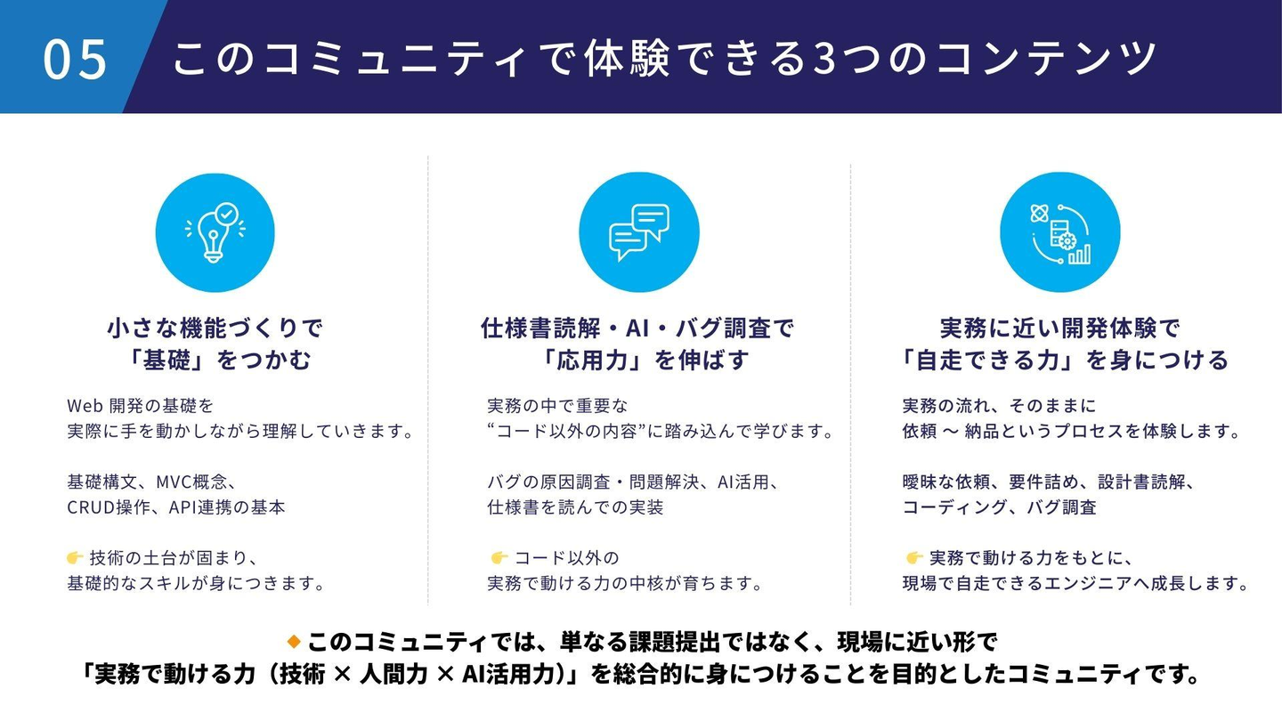 そこで私たちは、「技術 × 人間力 × AI活用力」を掛け合わせ、実務に近い形で学べる現場直結型コミュニティを立ち上げます!