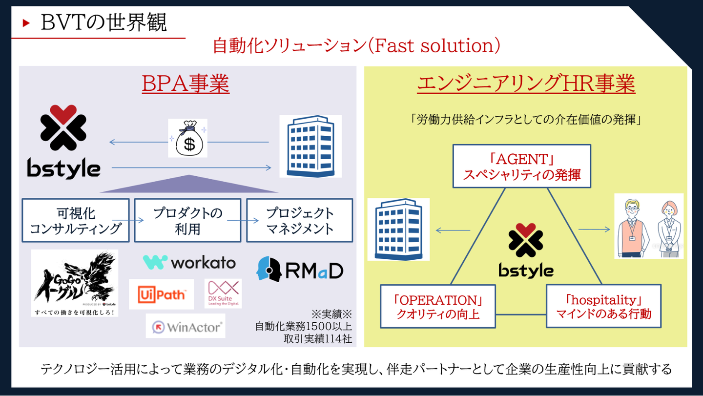 最後に、人材紹介・遣事業とは少し異なり業務の自動化とデジタル化・ITに特化する子会社、BVT(ビースタイル バリューテクノロジーズ)についてご紹介します。