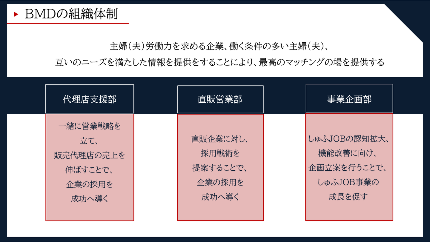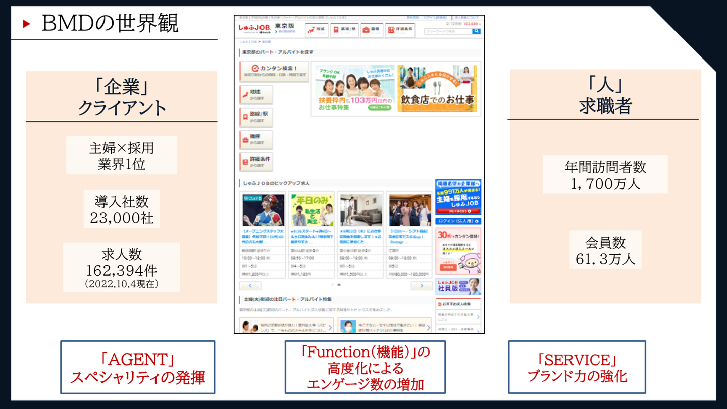 BSCでは企業と求職者との間にビースタイルが介在する価値を発揮していましたが、BMDではWEBメディアを通じて企業と求職者を繋いでいく世界観となります。しゅふJOBを使用して採用の成功をし事業成長を遂げることを目指します。