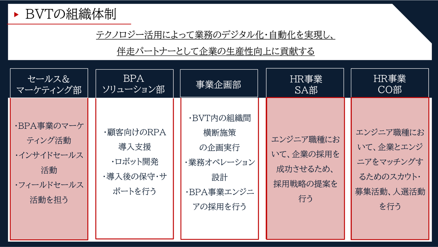 BVTの事業内容としては大きく分けて2つあり、①BPA(ビジネスプロセスオートメーション)事業 ②エンジニアリングHR事業(人材派遣事業)となります。