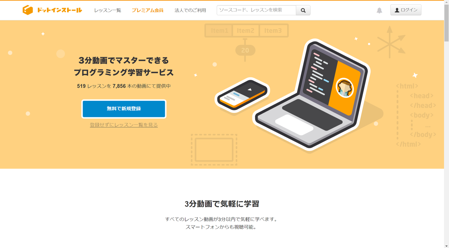 ドットインストールは3分の動画で段階的に学習が可能なサイトです。特徴は動画数の豊富さで、512レッスン・7747本の動画が提供されています。