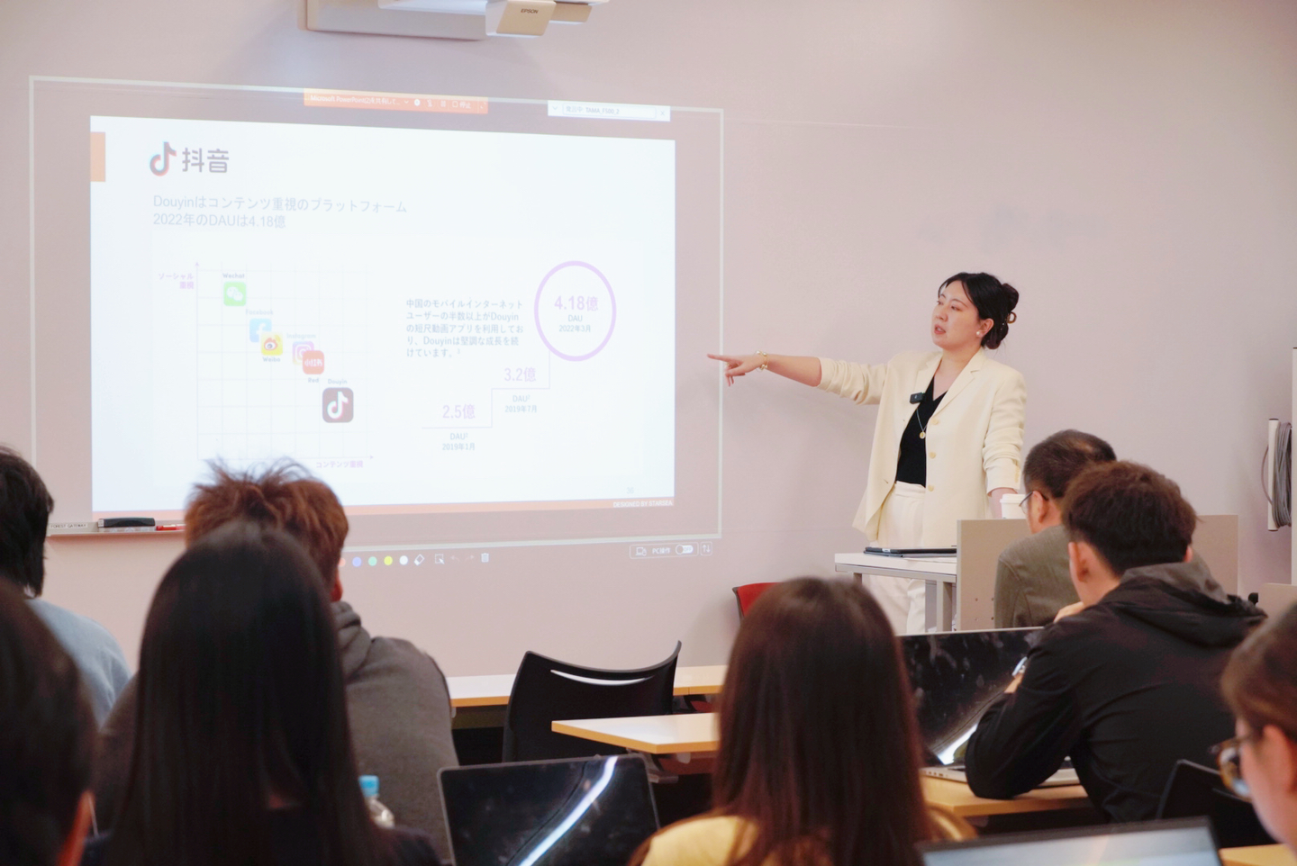 講演中、風間氏はライブコマースのメカニズム、その商業的潜在力について語り、特に中国市場での成功例を挙げてその進化を示しました。また、日本におけるライブコマースの今後の展望についても言及し、聴講した学生たちに新たな視点を提供しました。