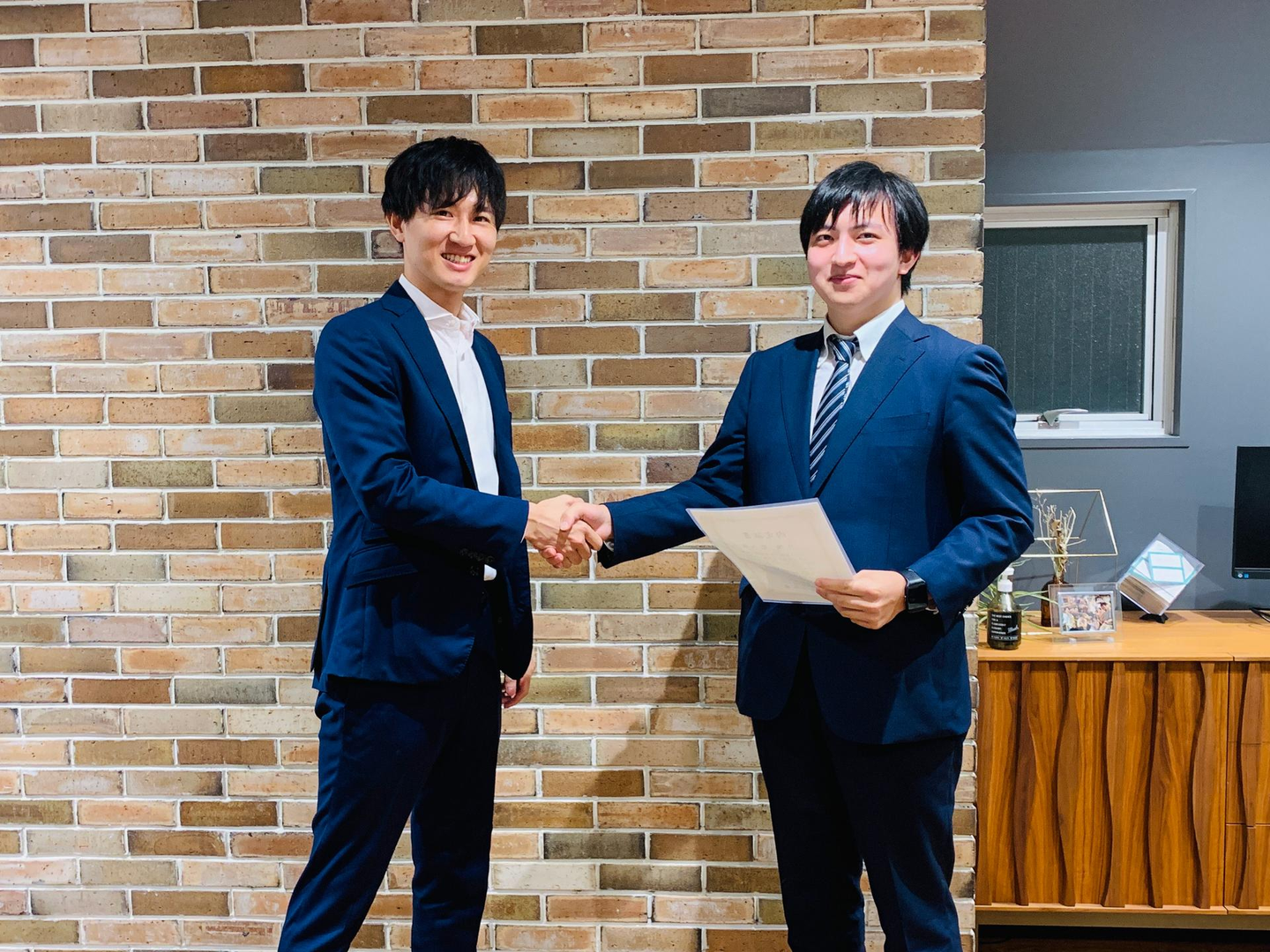 続いては内定証書授与です。代表から内定者一人ひとりに短いメッセージとともに証書が手渡しされ、固い握手が交わされました。