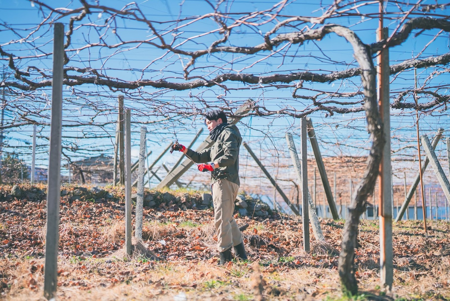 冬の農園で行ったのは、葡萄の剪定作業。一見シンプルに見えるが、その年の収穫量と品質を左右する最重要工程の1つだ。