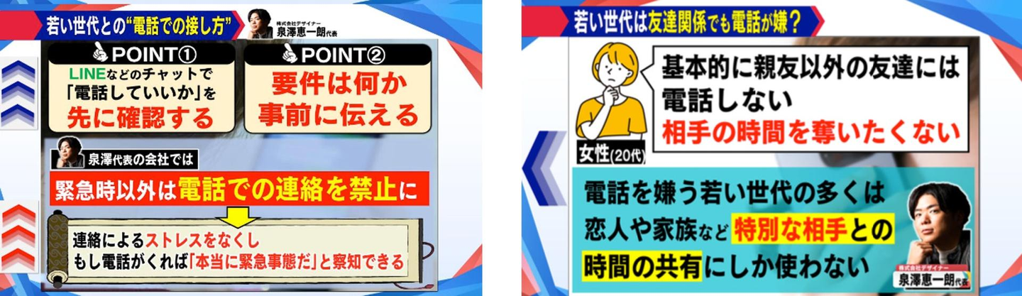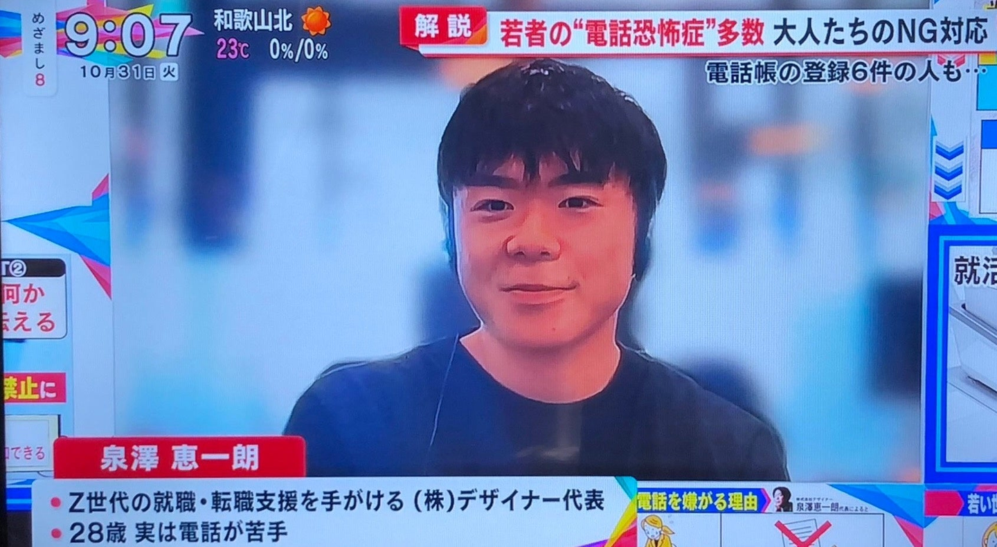 この度、"人材会社の定義をリデザインする"というビジョンのもと、Z世代の就職・転職支援を手がける株式会社デザイナー(本社:大阪府大阪市)の代表・泉澤 恵一朗が、10月31日(火)放送のフジテレビ系列朝の情報番組「めざまし8」にリモートで生出演し、Z世代ならではの"電話恐怖症"について解説しました。