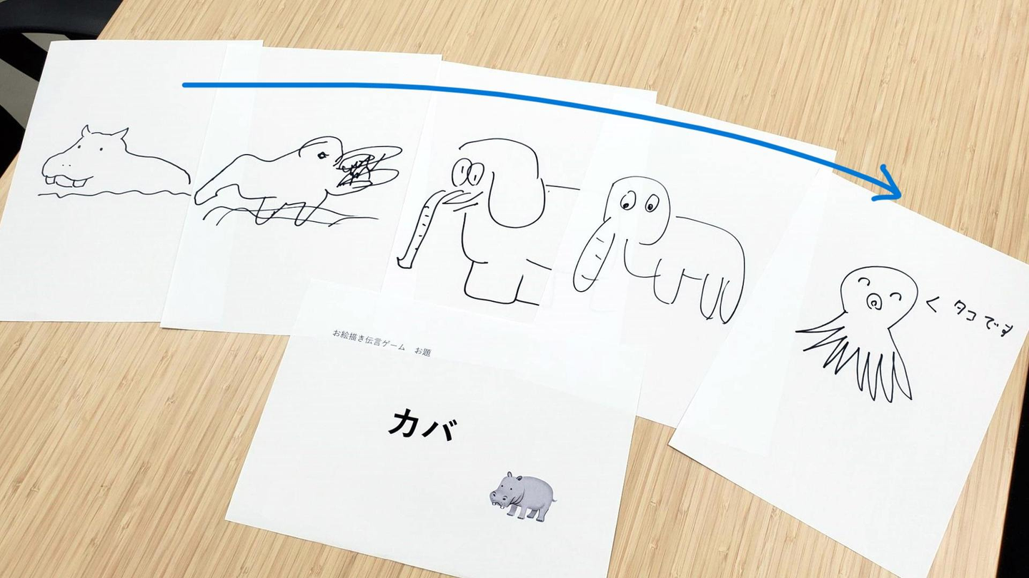 出題されたお題について、10人以上が並んだ列の最後尾まで、言葉でなく「絵」で伝言していくルールです。3つのグループに分かれ、別々のお題が出されました。
