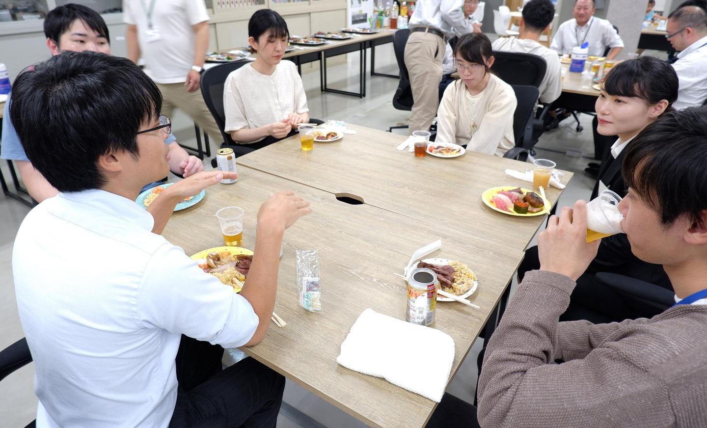 内定者ワークショップの裏側で、オフィスでは先輩たちが張り切って「こっちこっち!」「こんな感じ?」とワイワイ声を飛び交わせながら机を移動し、お料理をずらっと並べて・・・ビュッフェ会場につくりかわった本社で、内定者の皆さんをお迎えしました!