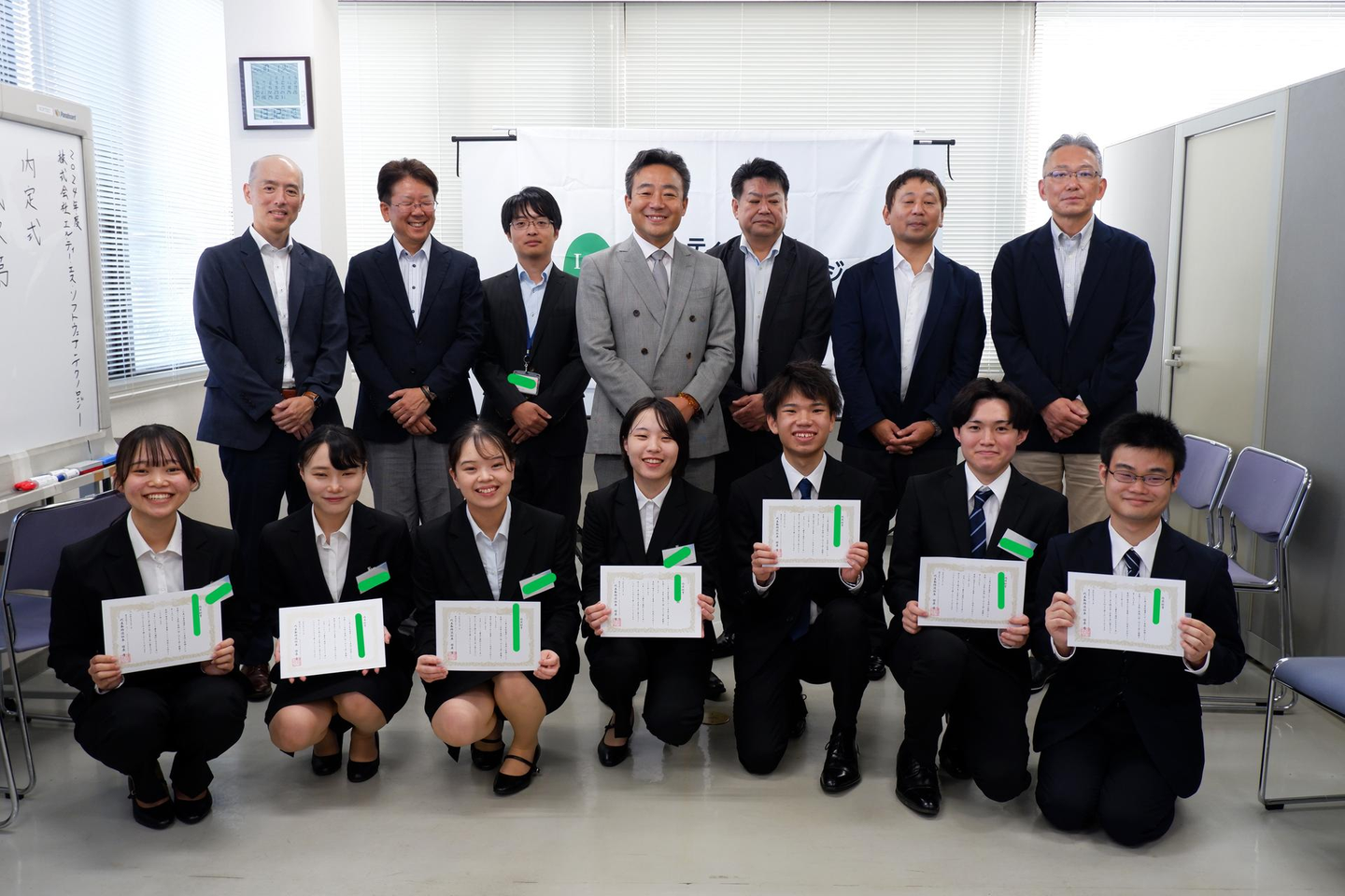この写真は、内定式後に撮った集合写真です!皆さんはにかんだり、満面の笑みだったりといい笑顔ですね!(実は、内定者の方・経営メンバーの方、皆さん口をそろえて「一番緊張した!!」とおっしゃていました。)