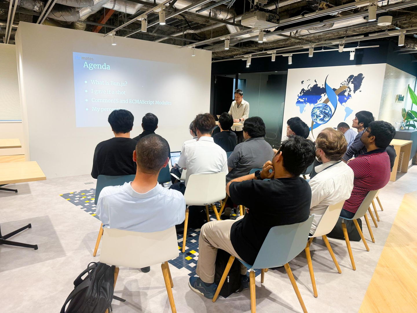 まずは先輩社員による、アイスブレイクを兼ねたライトニングトークを実施しました。トップバッターはIT本部ランゲージソリューション 開発グループリーダーの那須さん。Bun.jsをテーマとしたライトニングトークが英語で行われました。