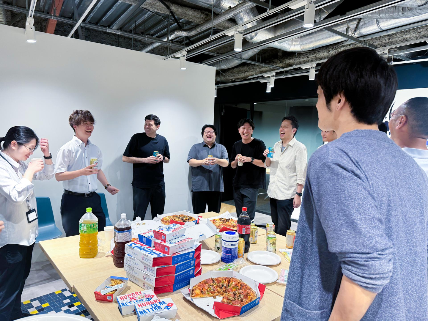 発表会後は、お待ちかねの懇親会です。ピザやお酒も用意され、和気あいあいとした雰囲気の中で、発表の感想や技術についての話が弾んでいました。