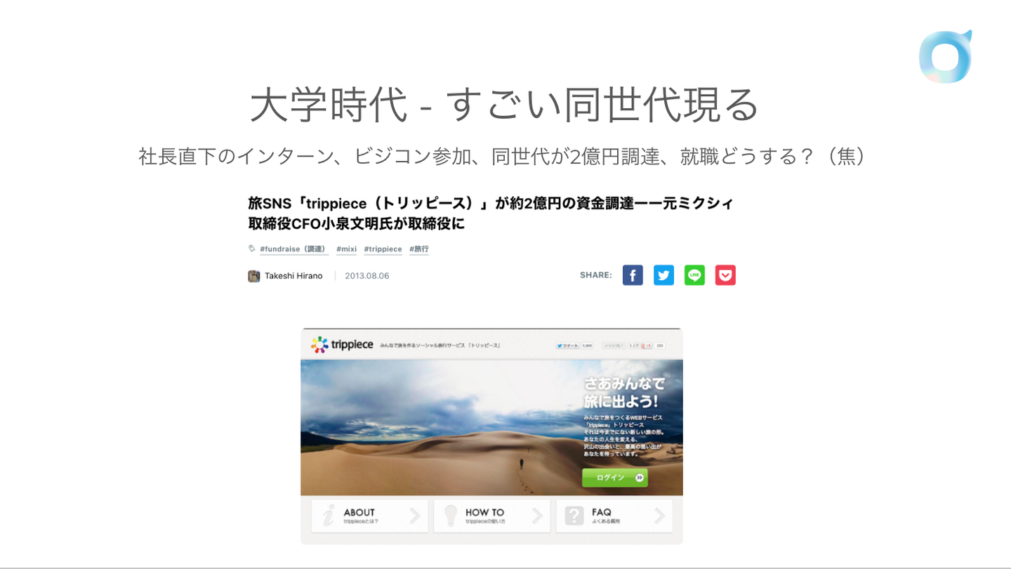 trippieceという学生発のベンチャーが2億円もの資金調達をしたというのです。今では数億円の資金調達も珍しくありませんが、2013年時点で、しかも学生で、この金額というのは当時の話題性がものすごいものでした。起業というものを漠然と思い描いていた私自身もめちゃくちゃ嫉妬しました。そして、私はこのまま就職していいんだろうか・・とちょっと悩むことになります。(結局これといった目的や解像度のビジョンを見出せず、新卒で前向きに入社をすることにはしました!)
