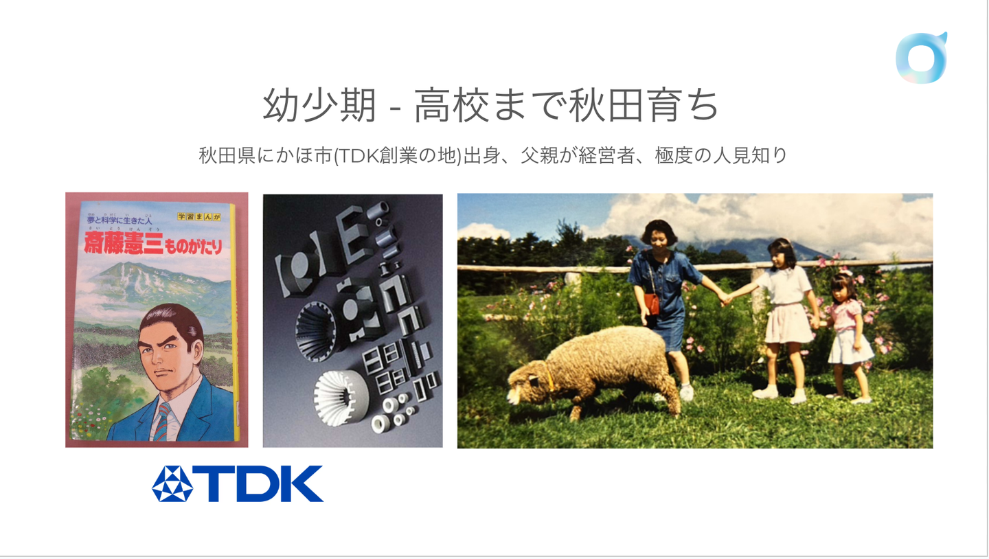 生まれは秋田県にかほ市で、本日時点時価総額が2.1兆円を超える、TDK 創業の地で生まれました。TDKは「フェライト」と言う材質(この画像真ん中にある磁石のようなもの)を使って事業を興されたのですが、子供の頃からフェライトを含む科学の情報や、齋藤憲三ものがたりという創業者の本にふれ合う機会が多かったため、漠然と「起業家」と職業は遠くない存在でした。また私の場合は、父親がフェライトを扱う会社を経営していたことも影響としては大きかったかと思います。