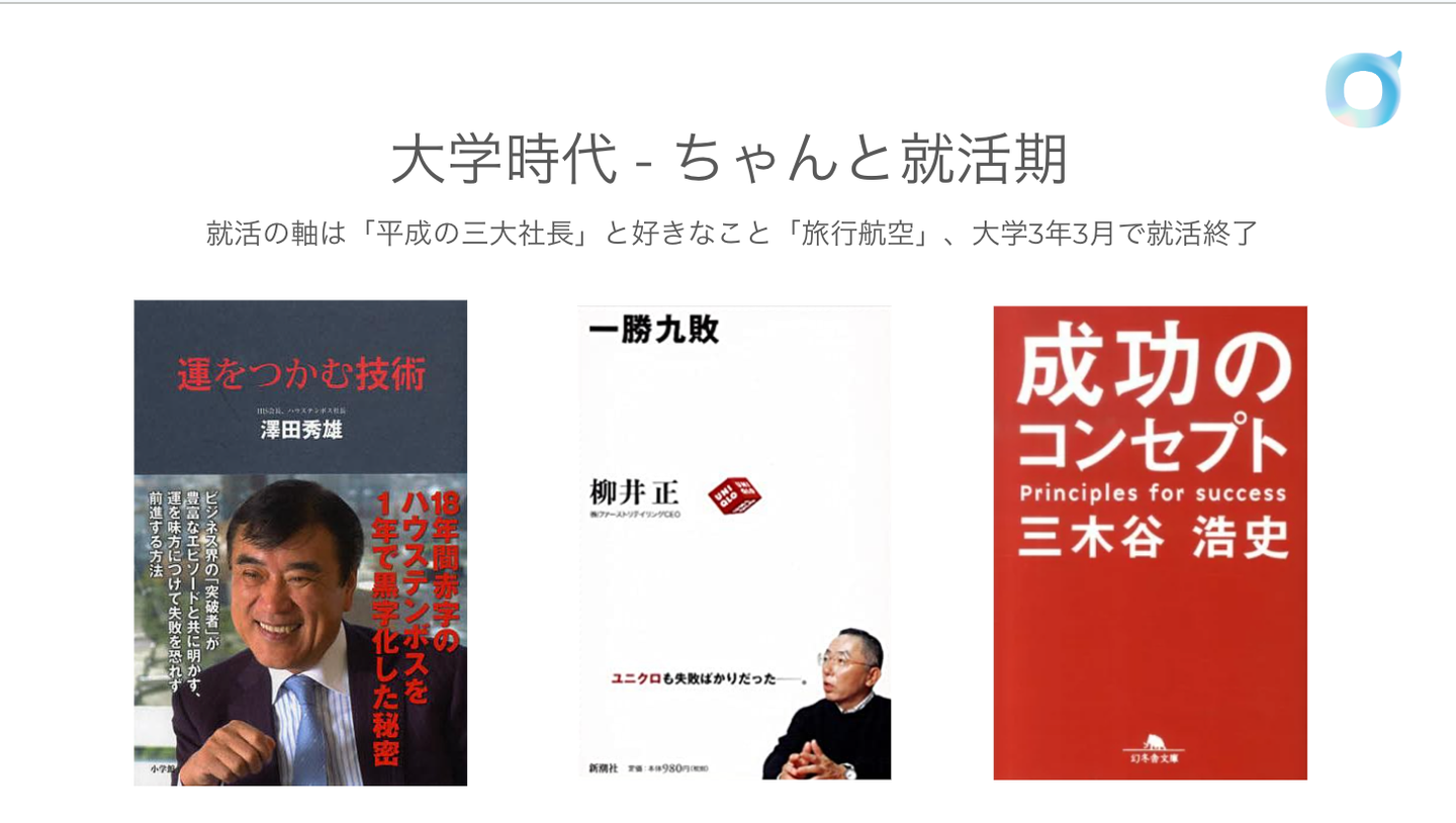 帰国してからは意外と真っ当に就活をしました。就活の軸は?ってよく面接とかで聞かれますが、私の場合は「アントレプレナーシップ」みたいなこと言ってました。平たくいうと、永遠ベンチャーみたいな会社でしょうか。そこで、平成の三大社長と言われていた、H.I.S.の澤田さん、ファーストリテイリングの柳井さん、楽天の三木谷さんの本を当時読み、この3社は受けようと決めました。