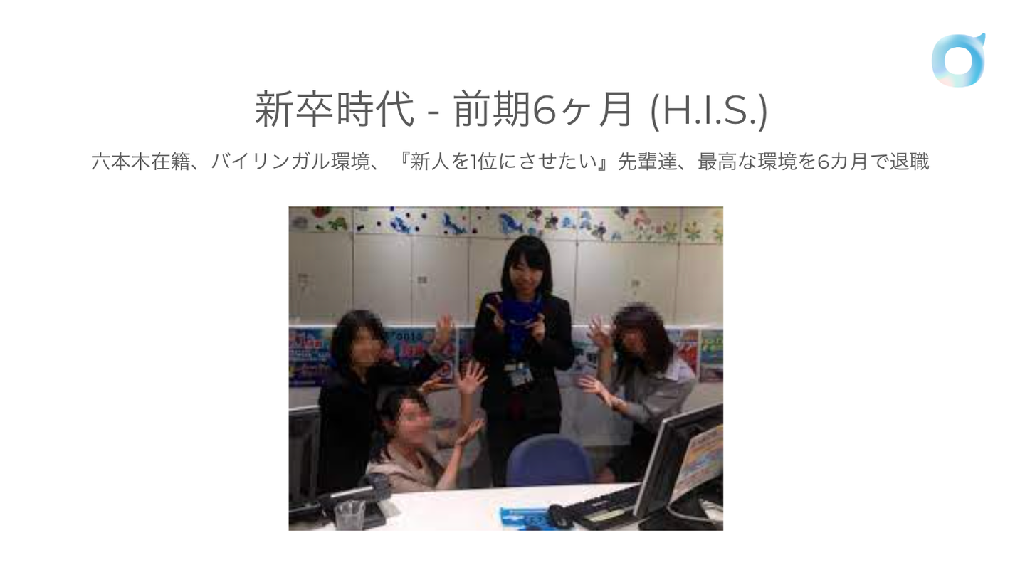 H.I.S.では六本木ヒルズの配属になりました。ビジネスクラス手配や外国人顧客の対応が多く、バイリンガル社員ばかりでした。新卒が配属されるのは初めてだそうで、先輩方や支店長にはすごく良くしていただきました。「うちの新人を1位にさせたい」という考えて積極的なフォローをくださったので、営業成績は同期600名中、毎週Top5には名前が入っていて、社内報に取り上げてもらっては皆で喜ぶという。配属ガチャ大当たり、私が凄かったというよりもフォローが手厚く上司に恵まれたばかりでした。
